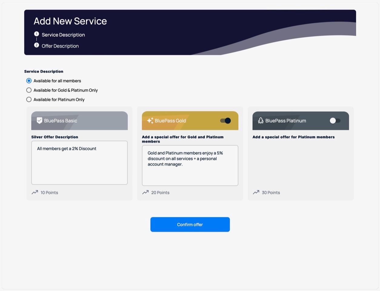 2. Service Providers can create, edit, activate and deactivate services, add multiple offers to each service that are only accessible by companies based on their current tiers.