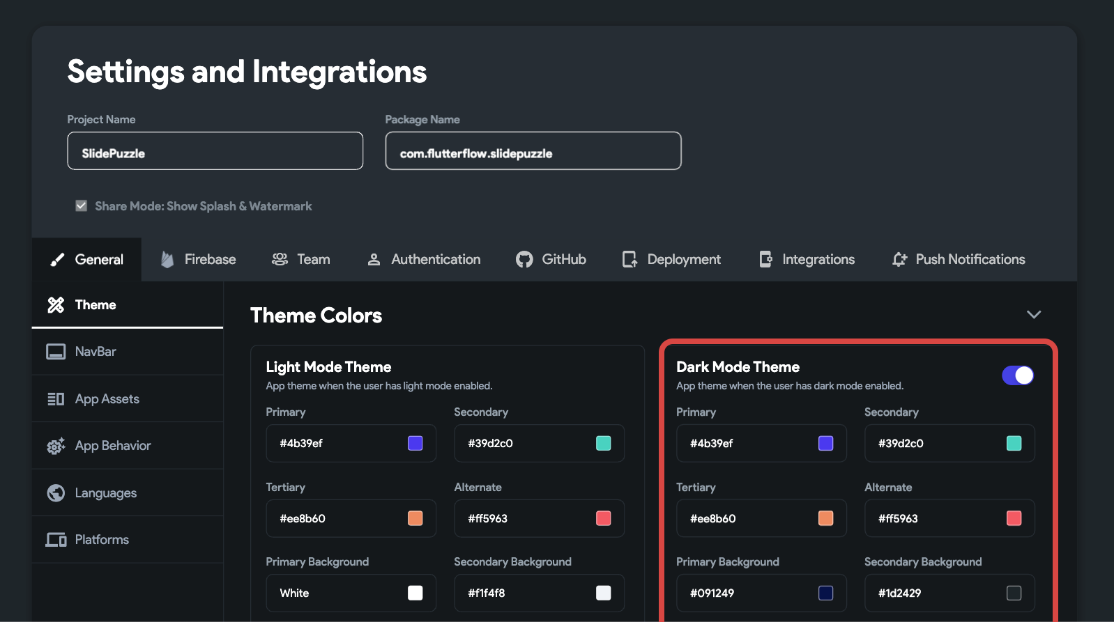 Dark mode support can be easily added to the Puzzle by going to the Settings & Integrations > Theme > Theme Colors, enable Dark Mode Theme using the toggle, and choose the appropriate colors to be used in the dark mode.