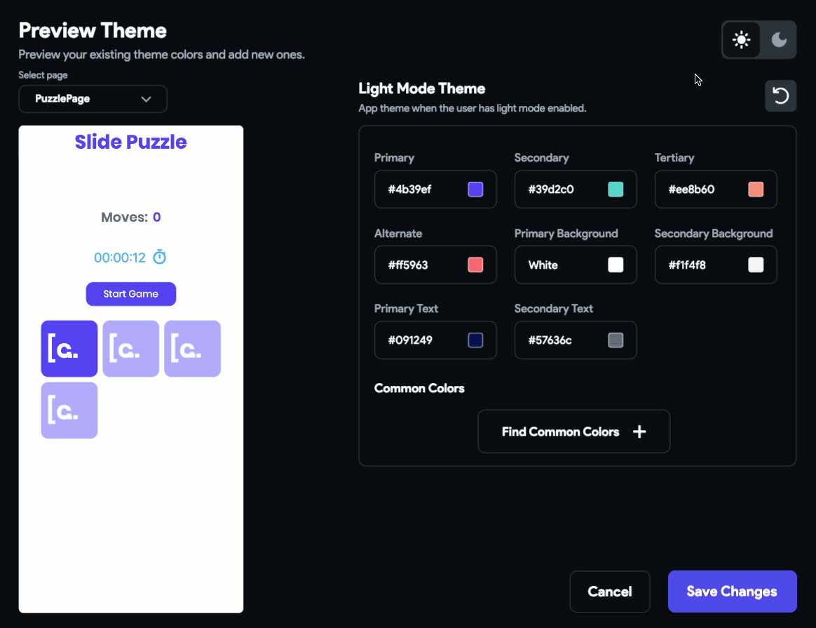 Click the Preview Themes button to see how the light and the dark mode themes look when applied on your PuzzlePage: