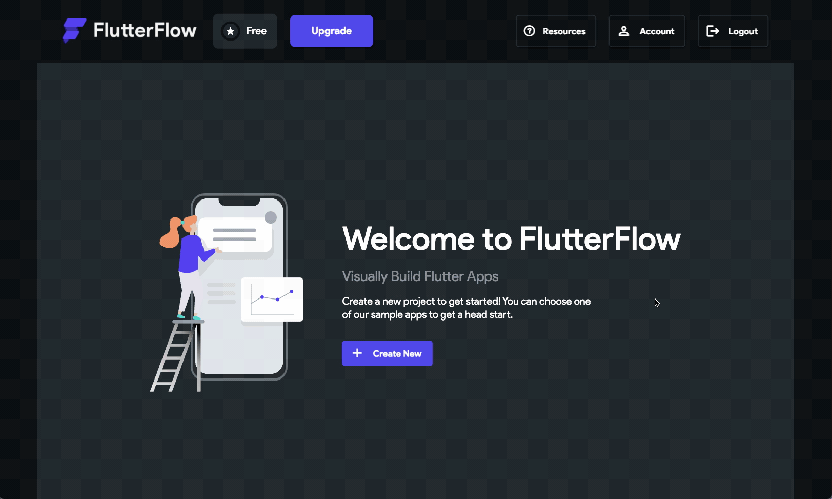 Once you successfully login to your account, you will be navigated to the FlutterFlow Dashboard page.