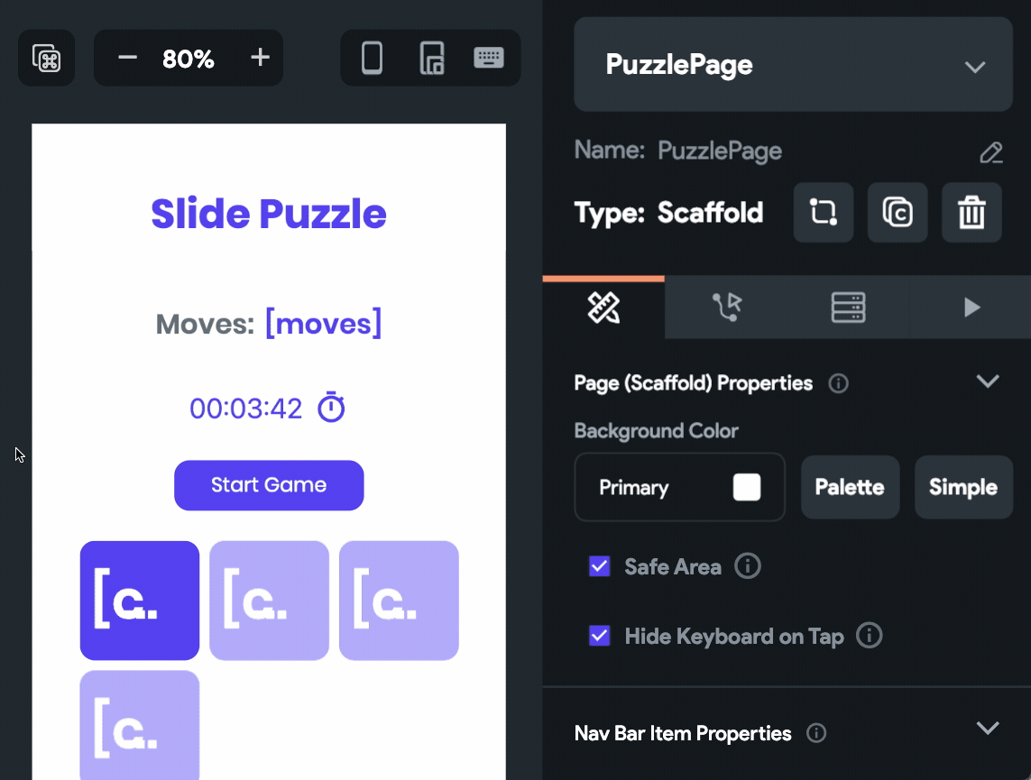Notice in the above demo, a stopwatch starts as soon as the Start Game button is tapped. This is one of the basic features that you can incorporate inside your puzzle. Though FlutterFlow doesn't provide a Timer widget, it won't stop you from adding a Custom Widget 😉.