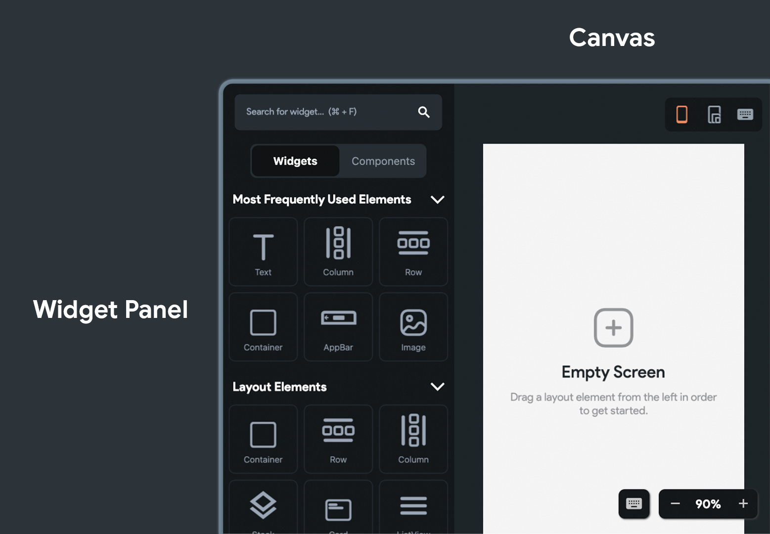 Canvas is the area where you would initially see “Empty Screen” written. The widgets can be found inside the Widget Panel section (present on the left) under the Widgets tab.