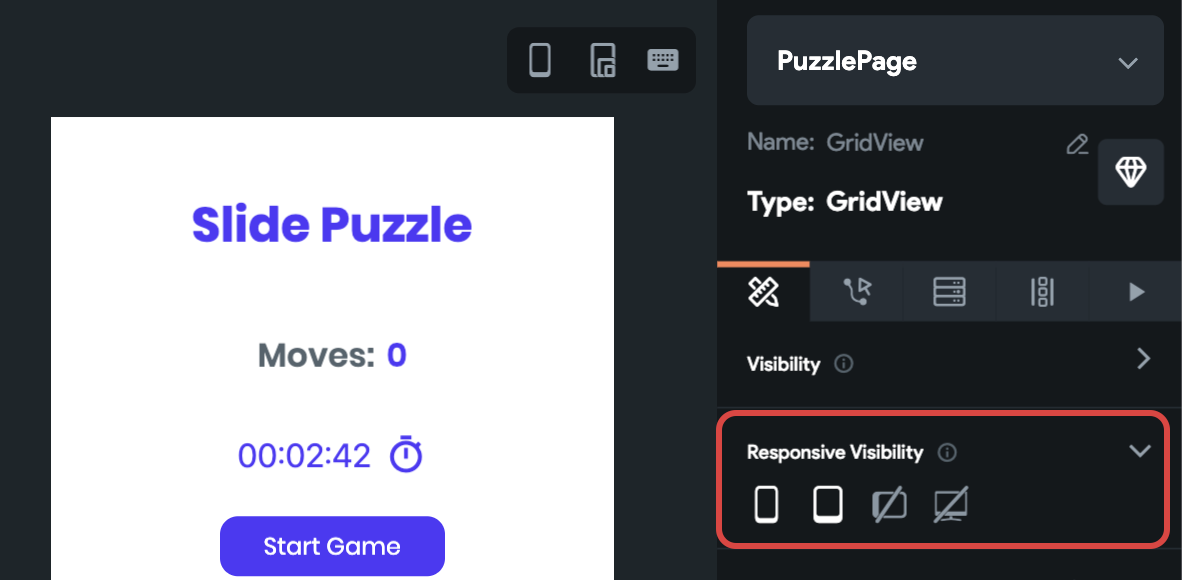 As this Flutter challenge is focused on the Web platform, responsive layout is one of the major criteria to get an edge over the other competitors. In FlutterFlow, you can select any widget and use the Responsive Visibility section (present inside the Properties Panel) to set on which type of display that particular widget should be visible. With the help of this, you can use different dimensions of widgets depending upon the screen sizes.