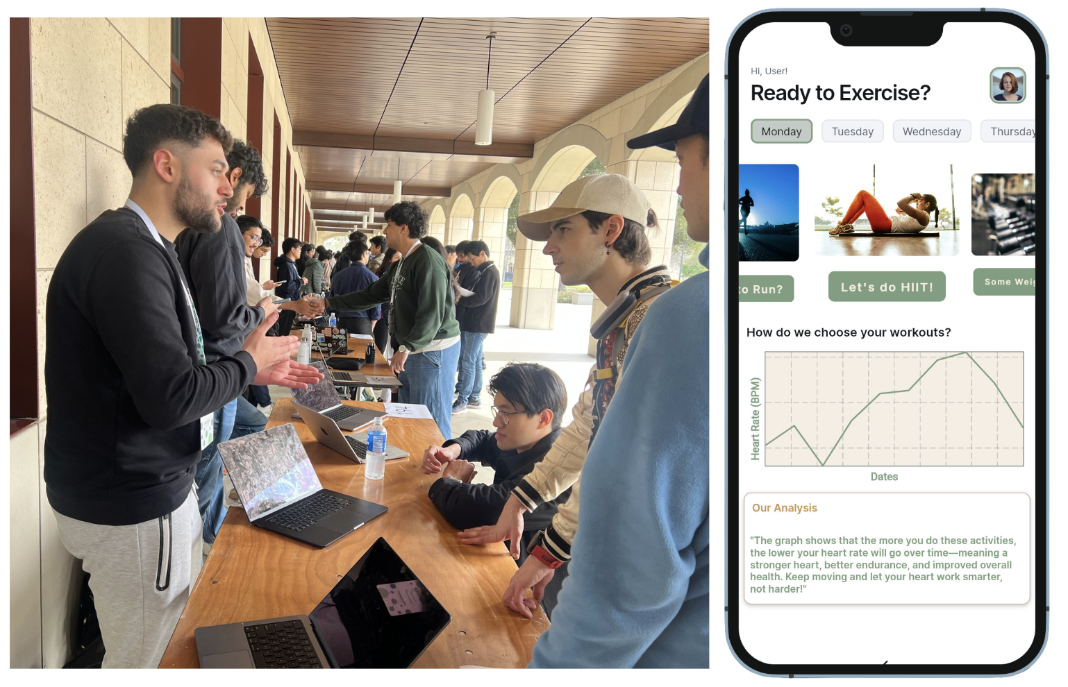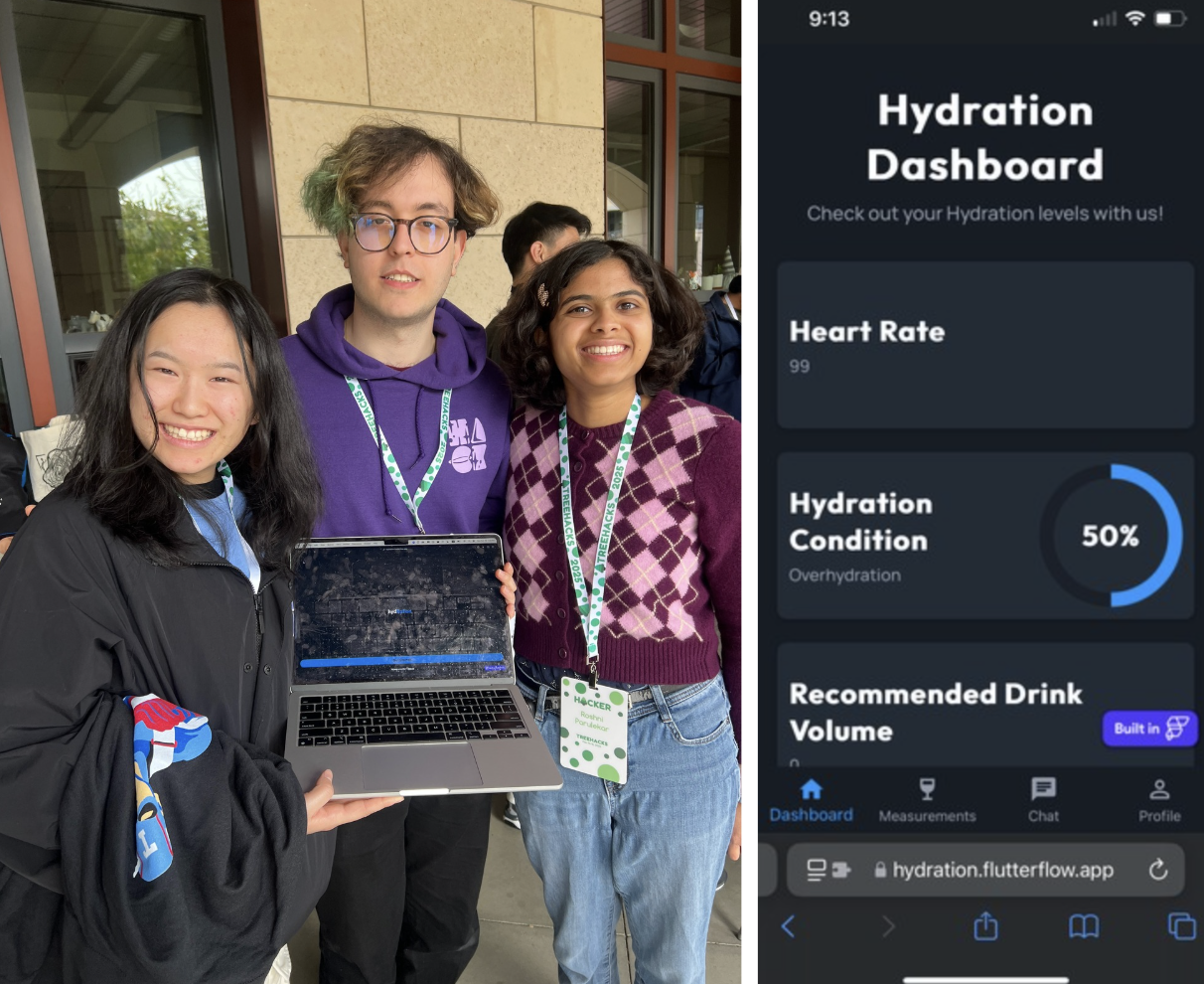Beginning with a meal plan template app, Roshni Parulekar-Martins, Mahdi Afshari, and Janet Guo built hydRation, an app that uses a phone’s camera to analyze a short video of a user's finger, extracting a PPG (photoplethysmogram) signal to assess hydration levels in real-time and notify users when they need to drink more water. They used Firebase cloud functions to connect with their custom Python backend used to process the user’s video and PPG signals. Their app won 2nd place in the Health Command Center Challenge sponsored by TerraAPI.