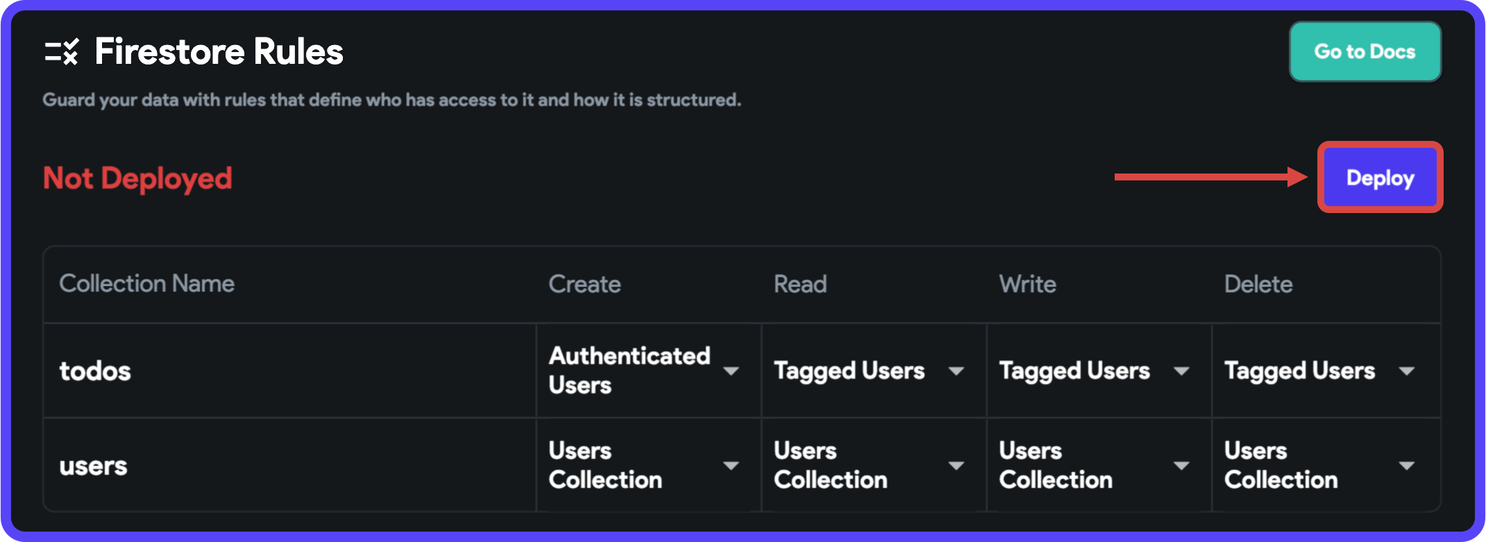 Once you have the security rules defined, you can also see a preview of the rules. Now, click on the Deploy button to upload the rules to Firestore.