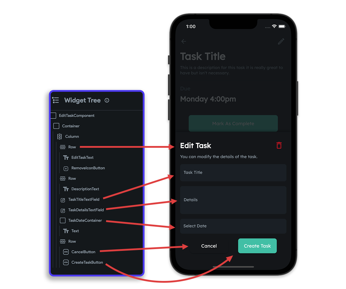 is_donefield of a task to True. - On EditTaskComponent, the Update Task button should update the title, description, and date of the task to the new ones that are specified in the TextFields.