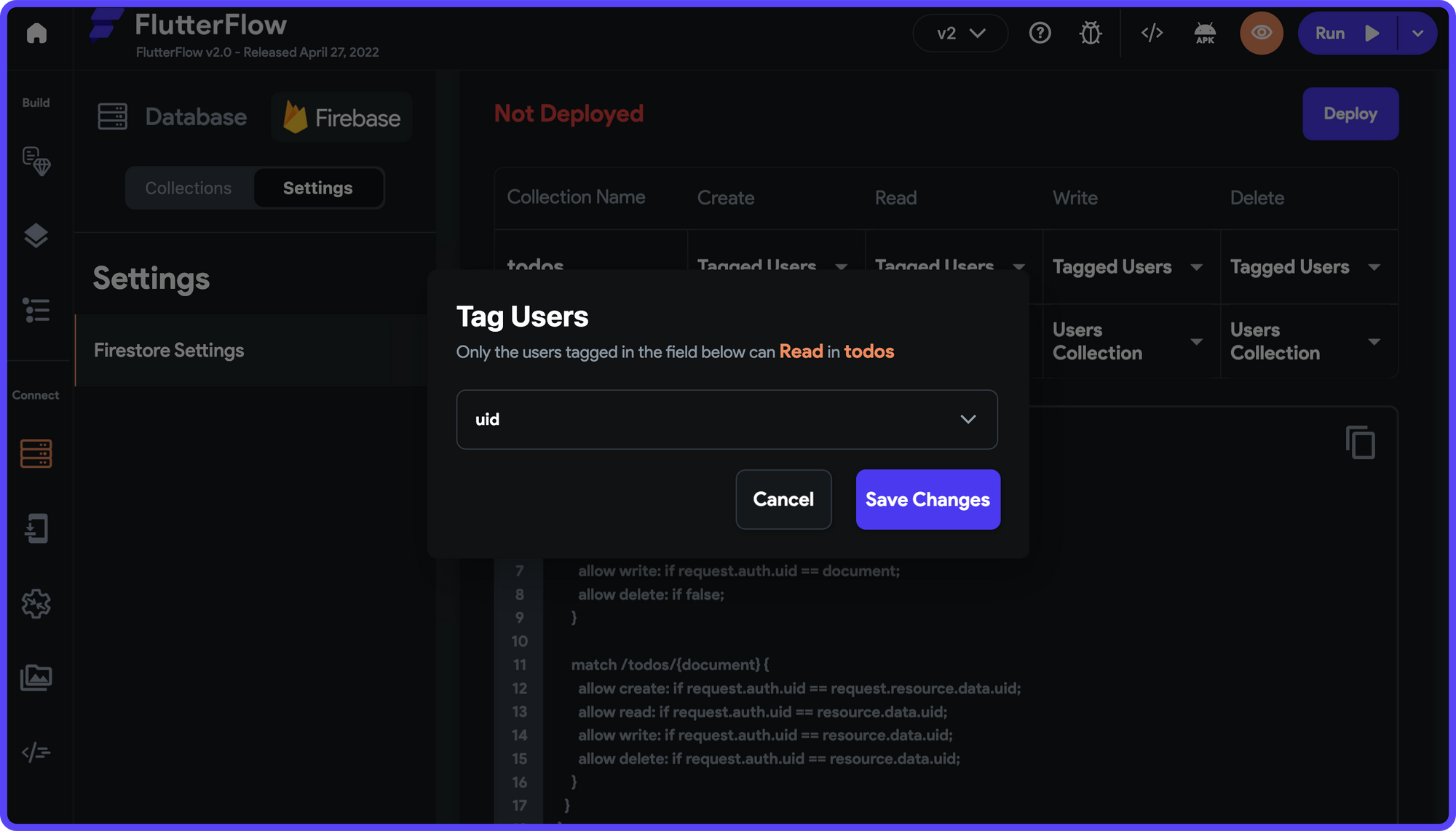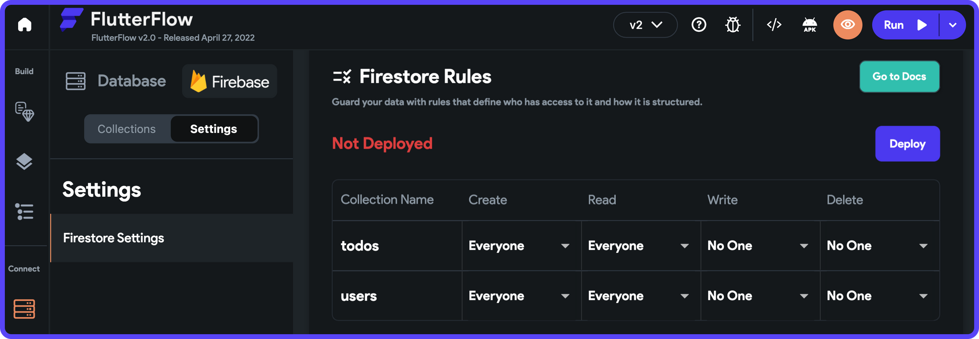 The default rules that FlutterFlow sets on any new collection are as follows: