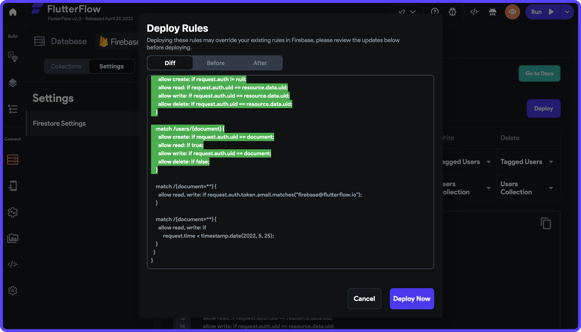 This will open up a dialog showing the updated security rules that you are going to upload. Click Deploy Now.