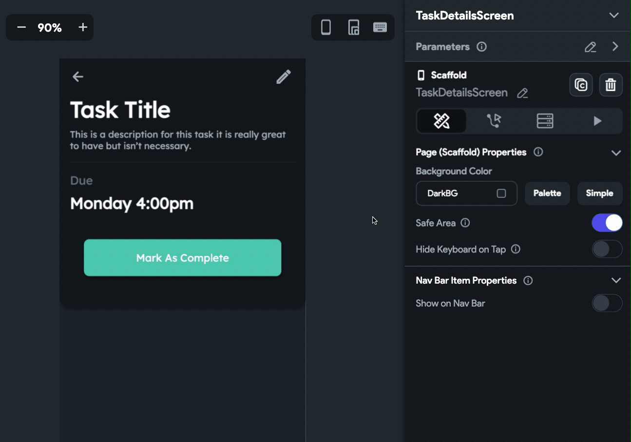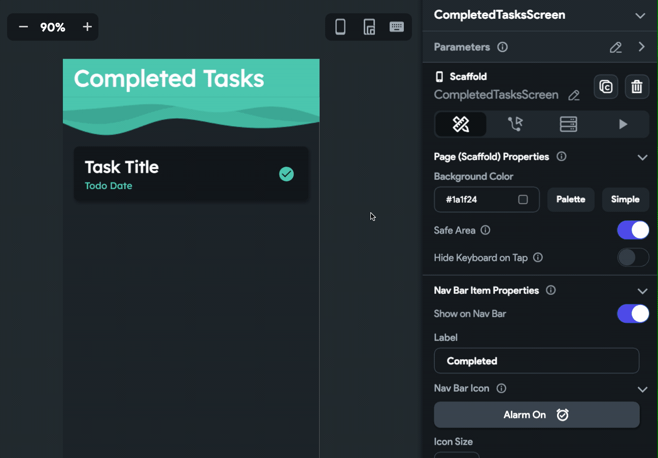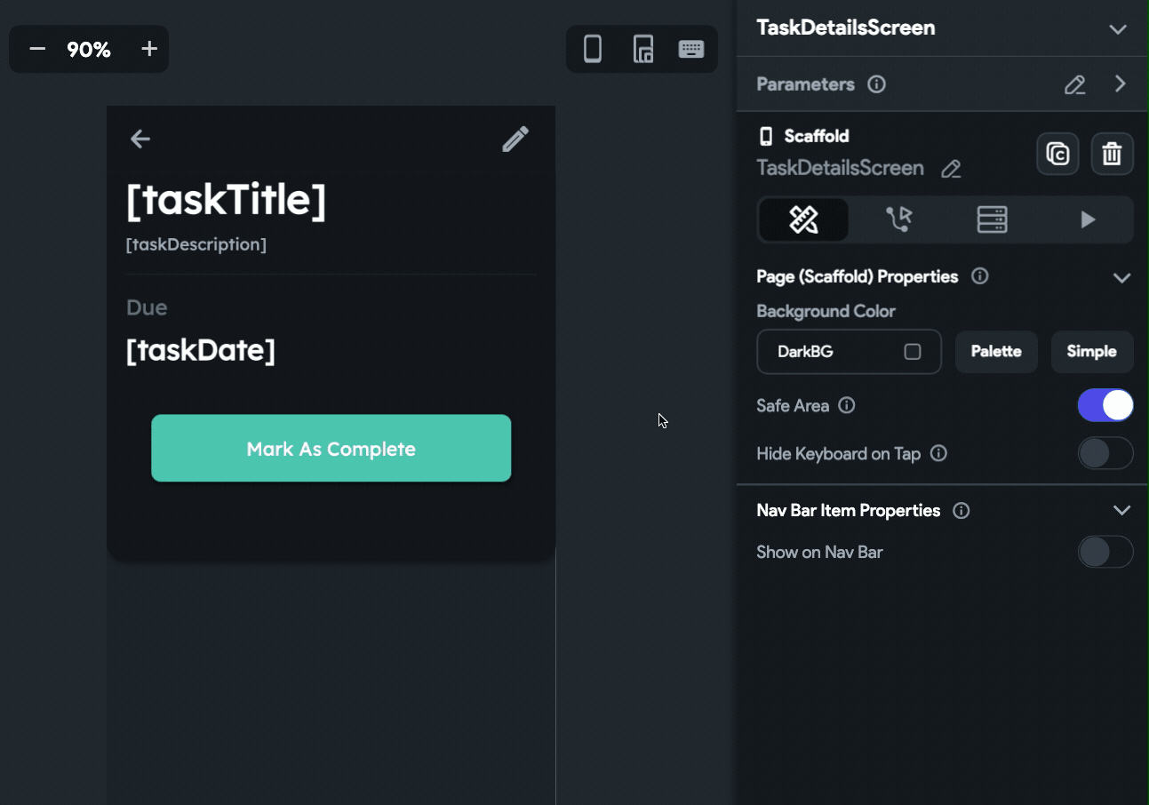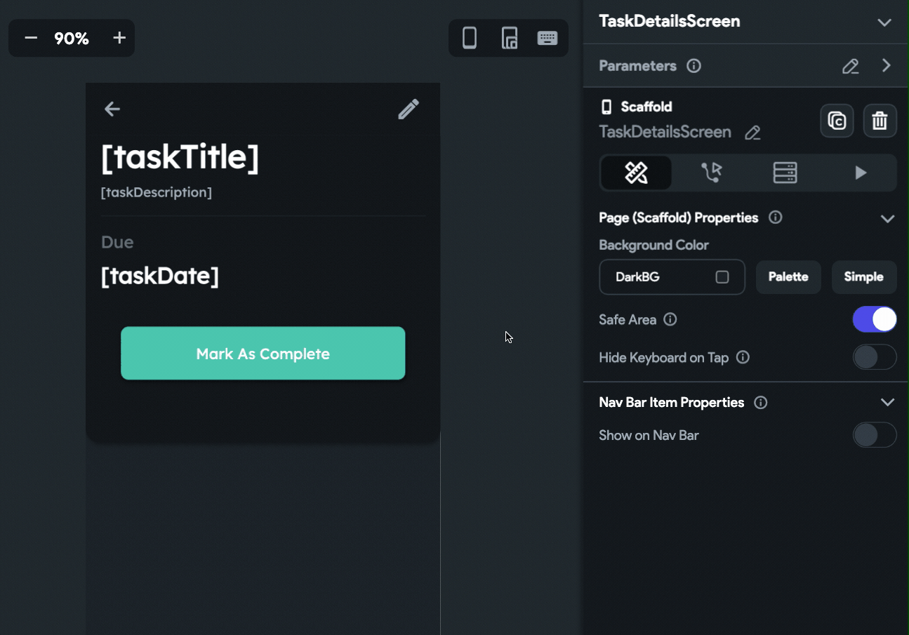 We also need the record data on the TaskDetailsScreen. Let's pass it inside the Navigate action as a parameter: