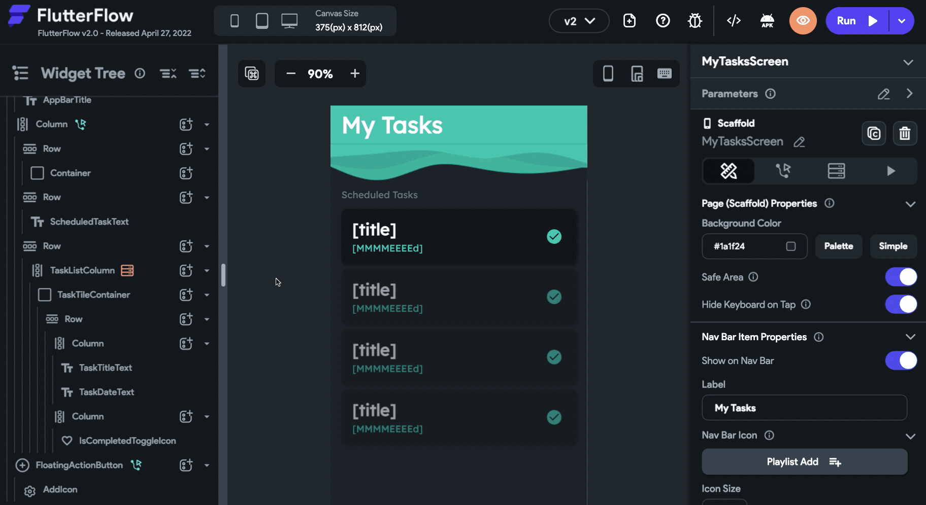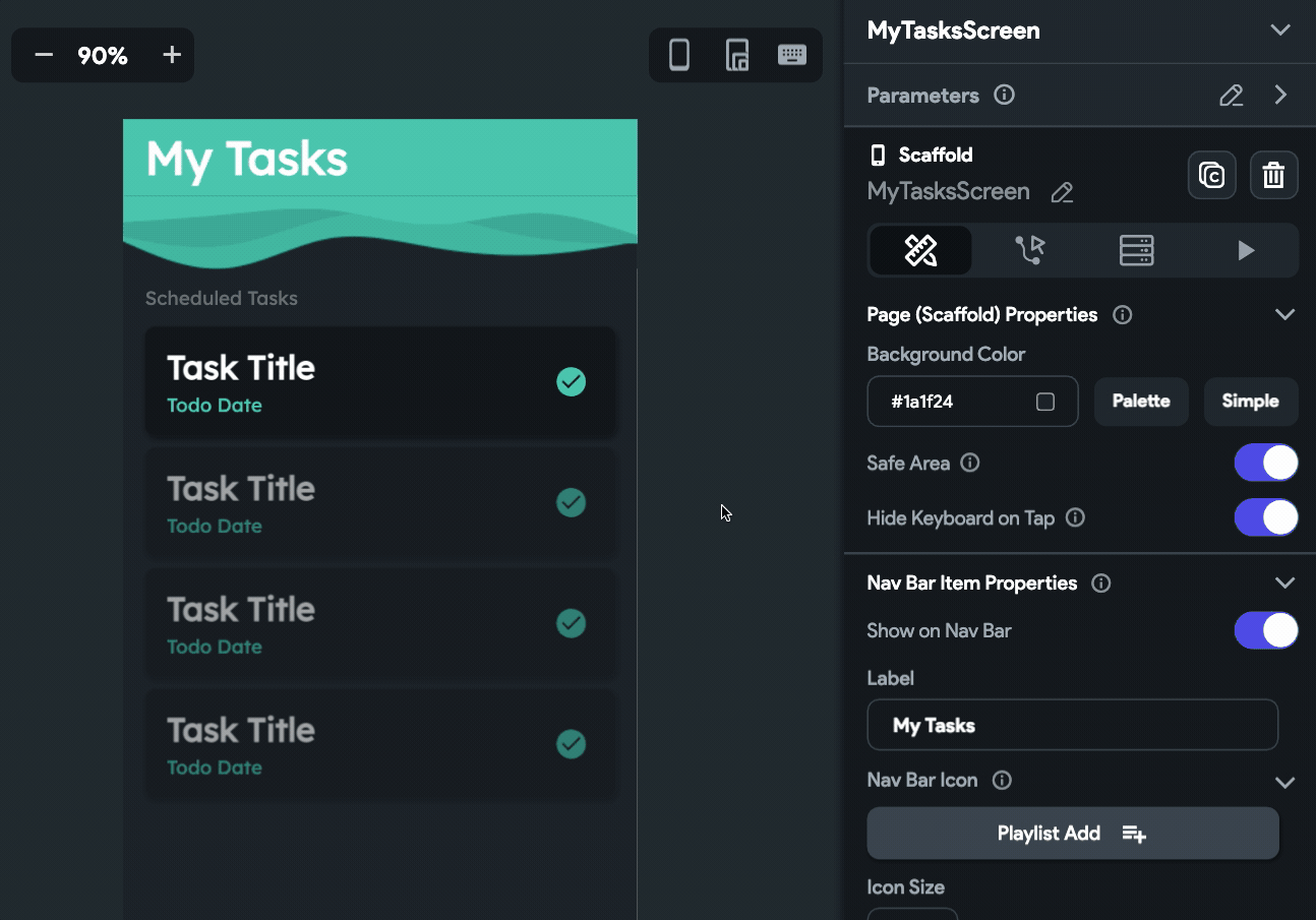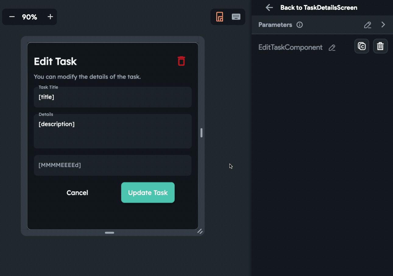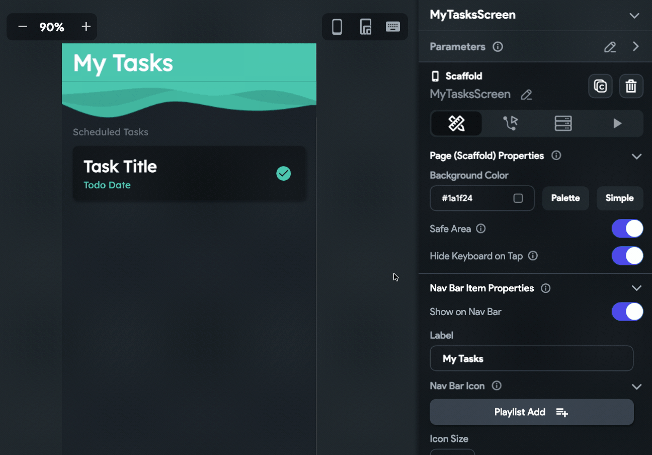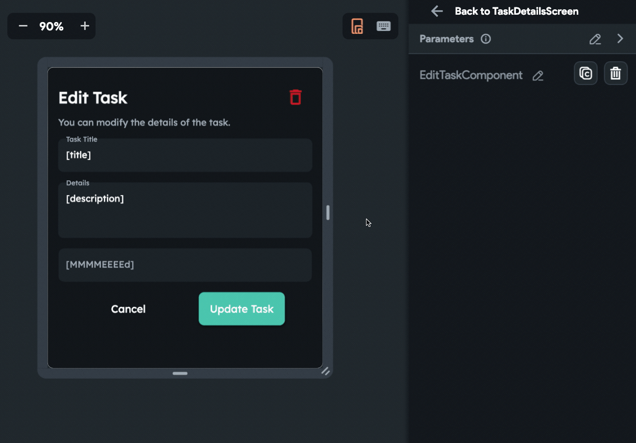 - Now, go to the MyTasksScreen and select the task tile on which the Navigate action is set. Remove all the non-existing parameters and pass the taskData parameter with the Source as todos Record.