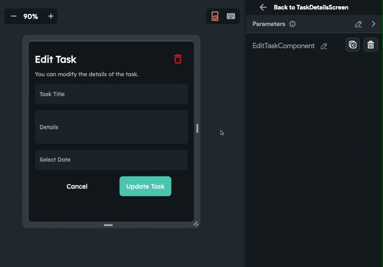 Before you can update a task from the EditTaskComponent, you need to pass the record from the TaskDetailsScreen.