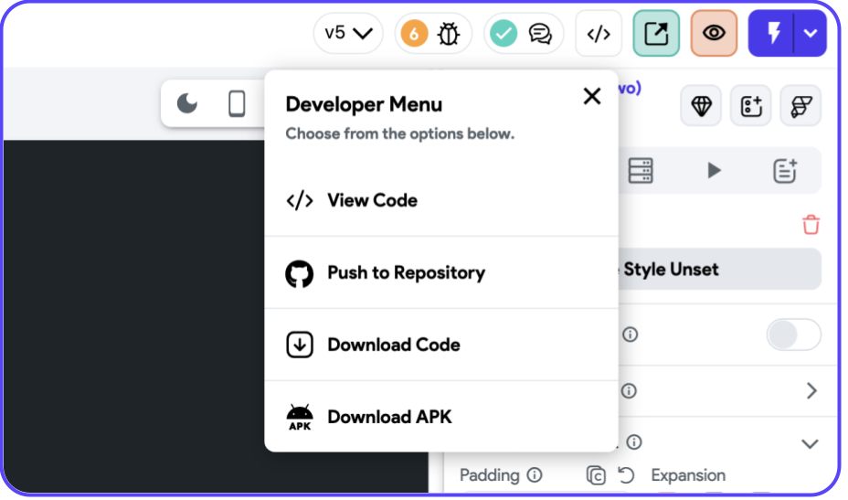 In your FlutterFlow project window, tap the </> Developer Menu icon in the top right, then select Download Code.
