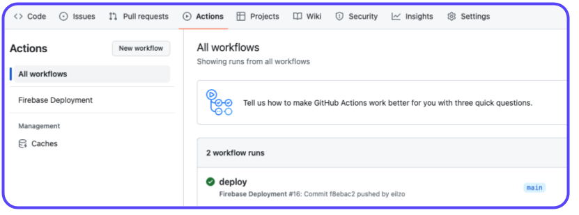 Here, you can see your Action in progress. Once it's successful, try opening your Firebase console again, where you'll see a new successful deployment!