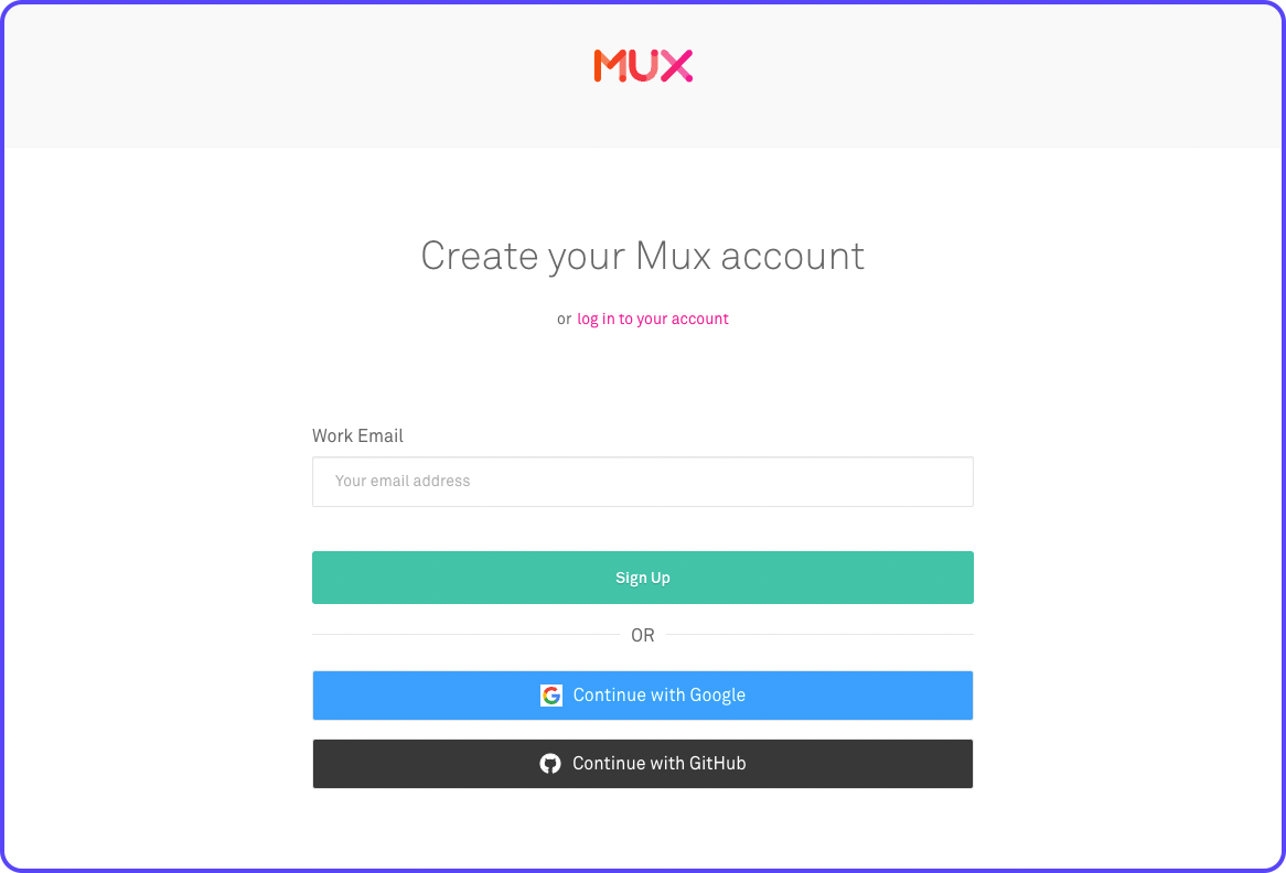 To get started using Mux, create an account by going here. If you already have an account in Mux, just use that to log in.