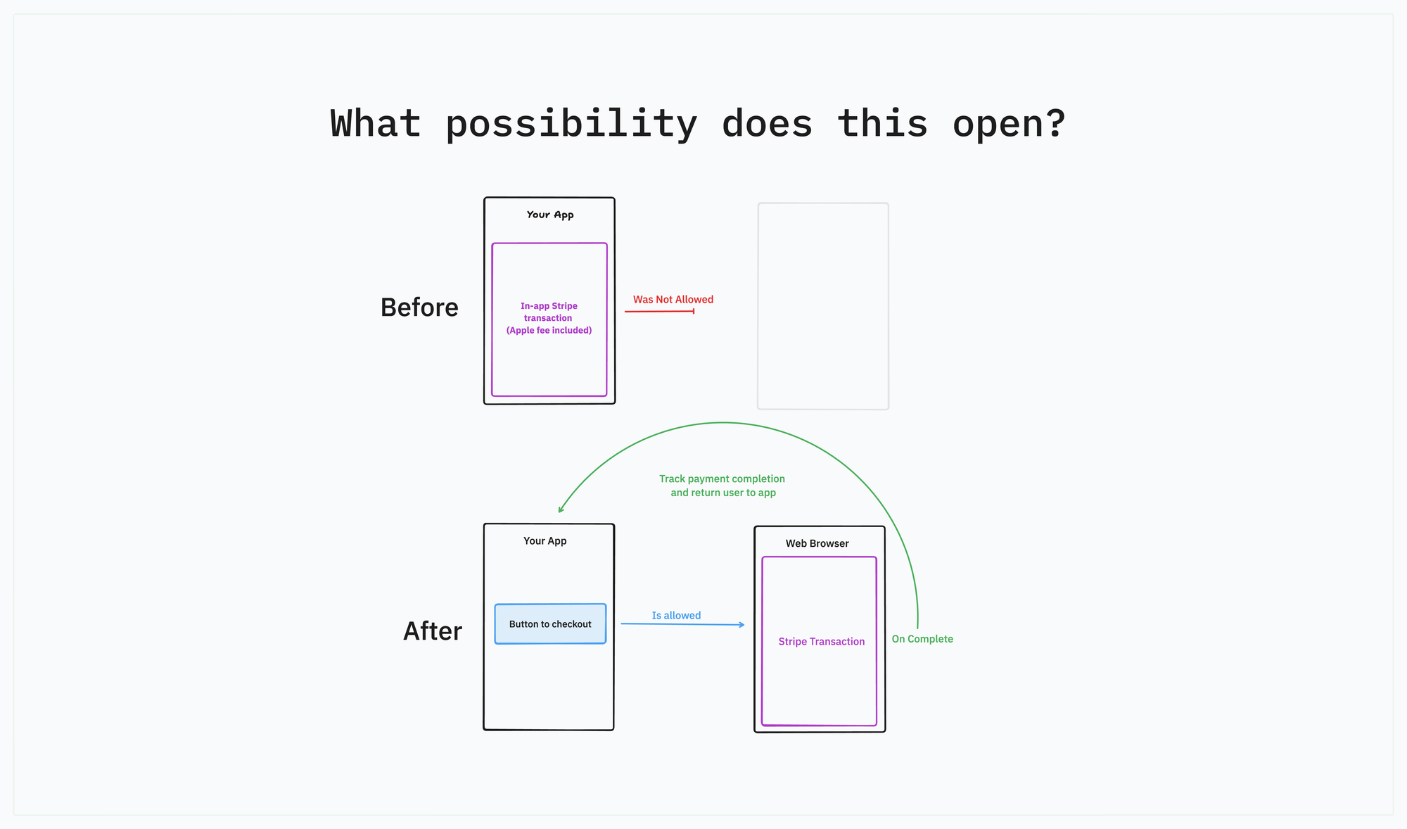 Now, you can implement a single, consistent Stripe payment flow across all platforms - web, Android, and iOS - without being forced to use Apple's in-app purchase system for iOS users.