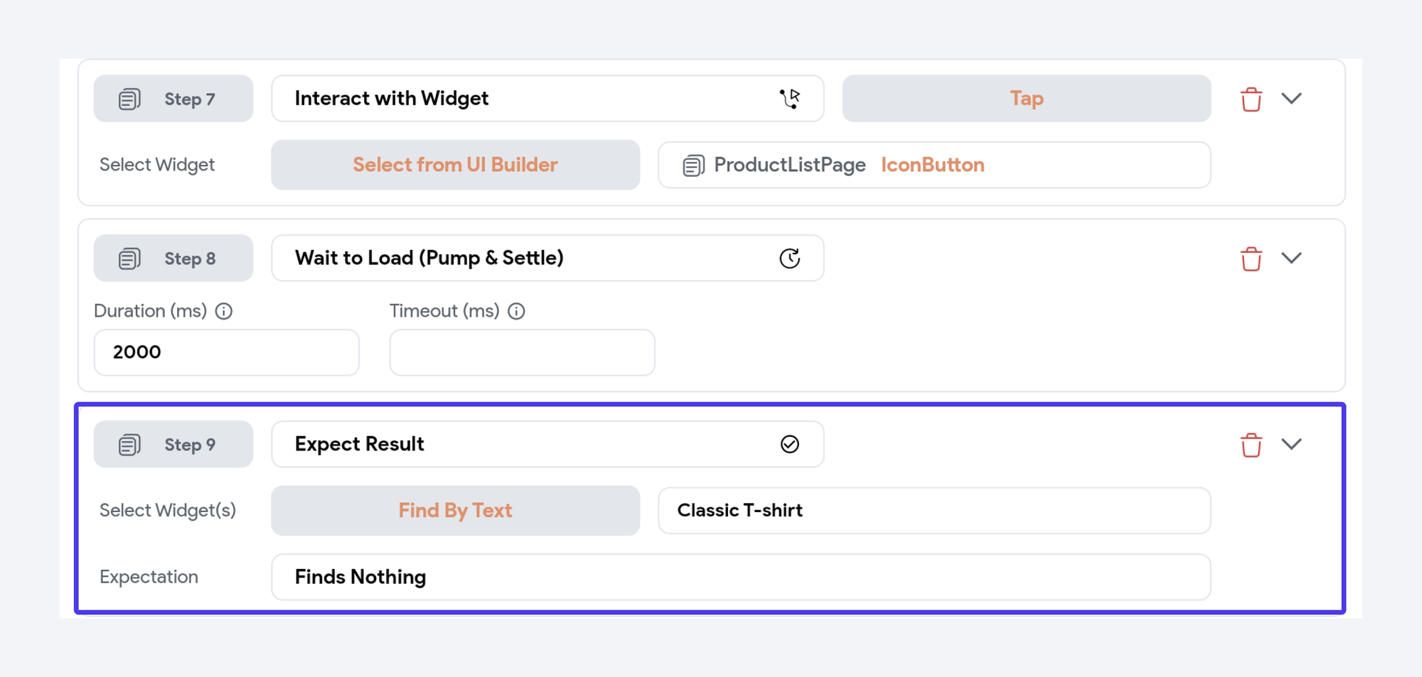 - Define assertions such as “this widget should be visible” or “this text should equal X”