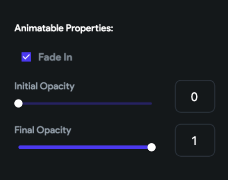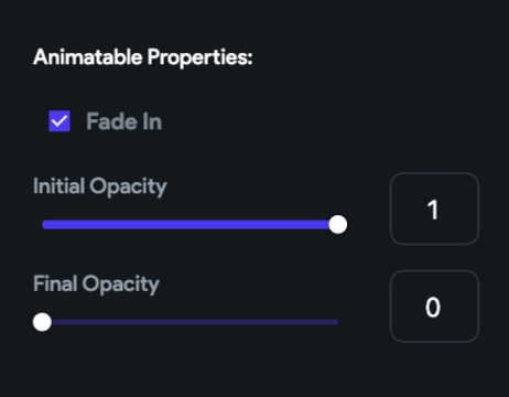 To use the fade animation, check the Fade In checkbox. By default, you will see the Initial Opacity is set to 0 and the Final Opacity is set to 1.