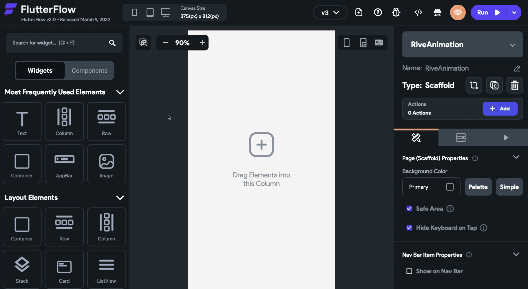 - Drag and drop the RiveAnimation widget onto the canvas.