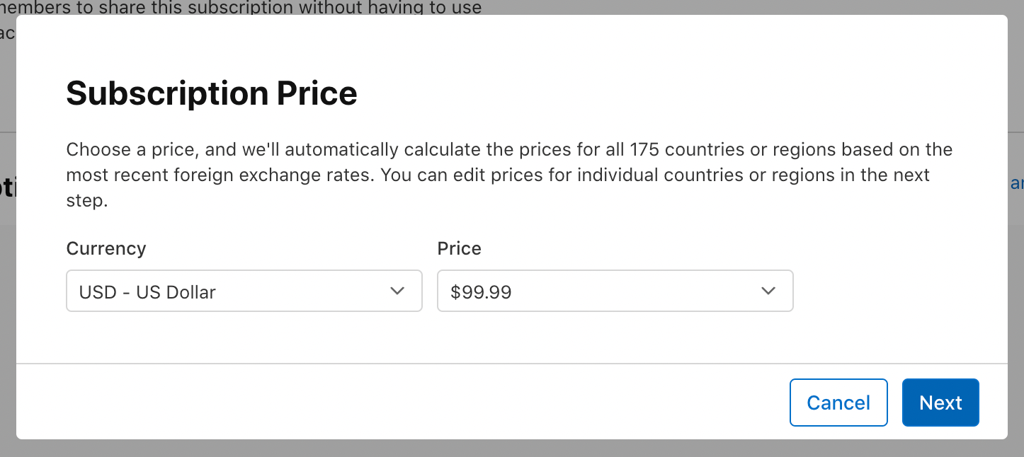 10. Enter the subscription price in your preferred currency. Click Next.