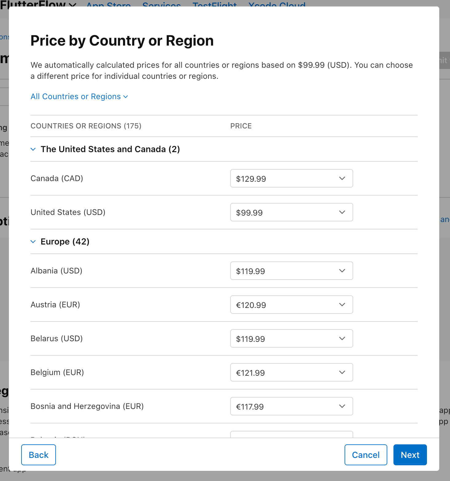 11. The next page will show you the automatically calculated prices for other countries and regions. Click Next.