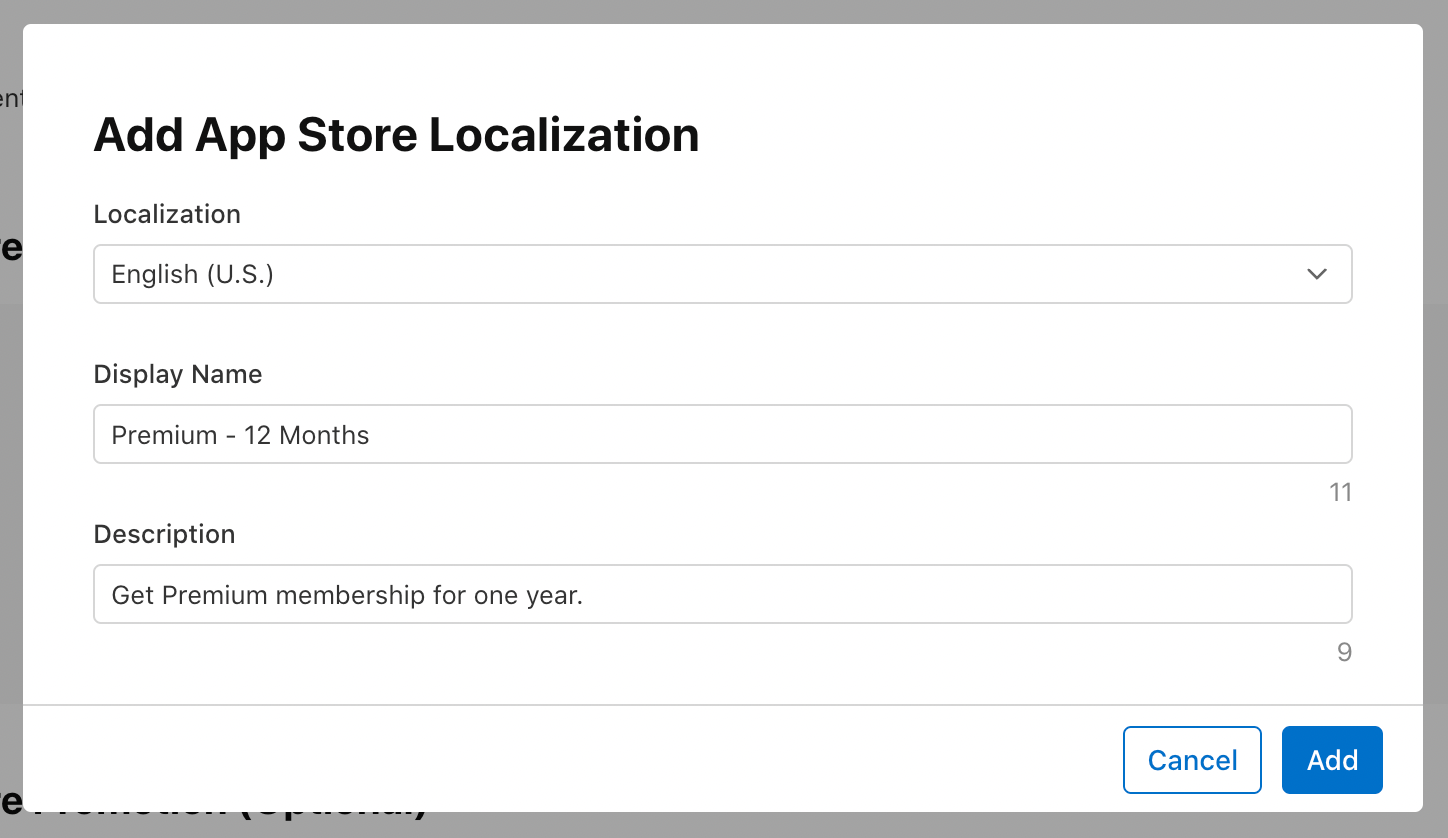 18. This will take you back to the subscription group page. Click Create under App Store Localization.