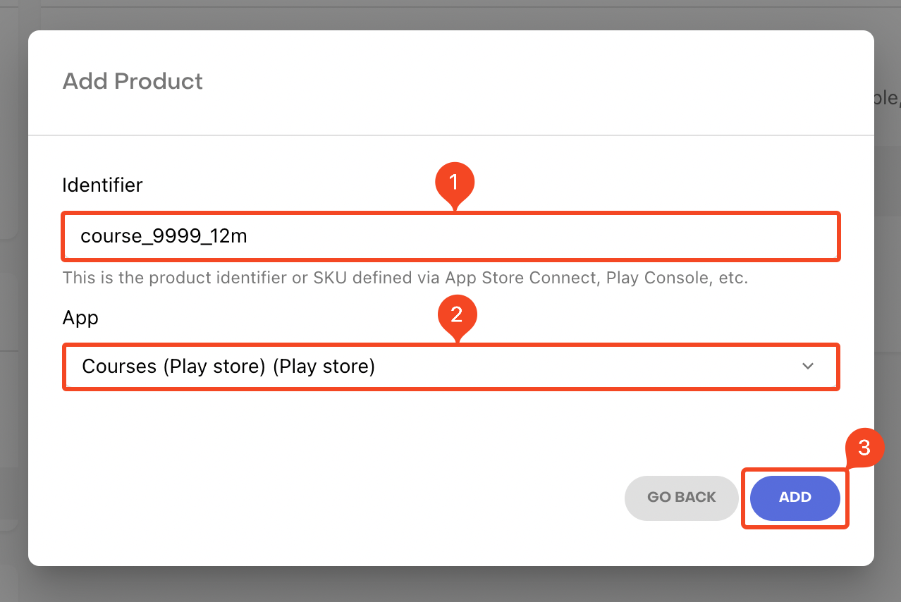 2. You need to enter the product Identifier and the App. Make sure you use exactly the same product ID you used for the Android/iOS subscription. Click ADD.