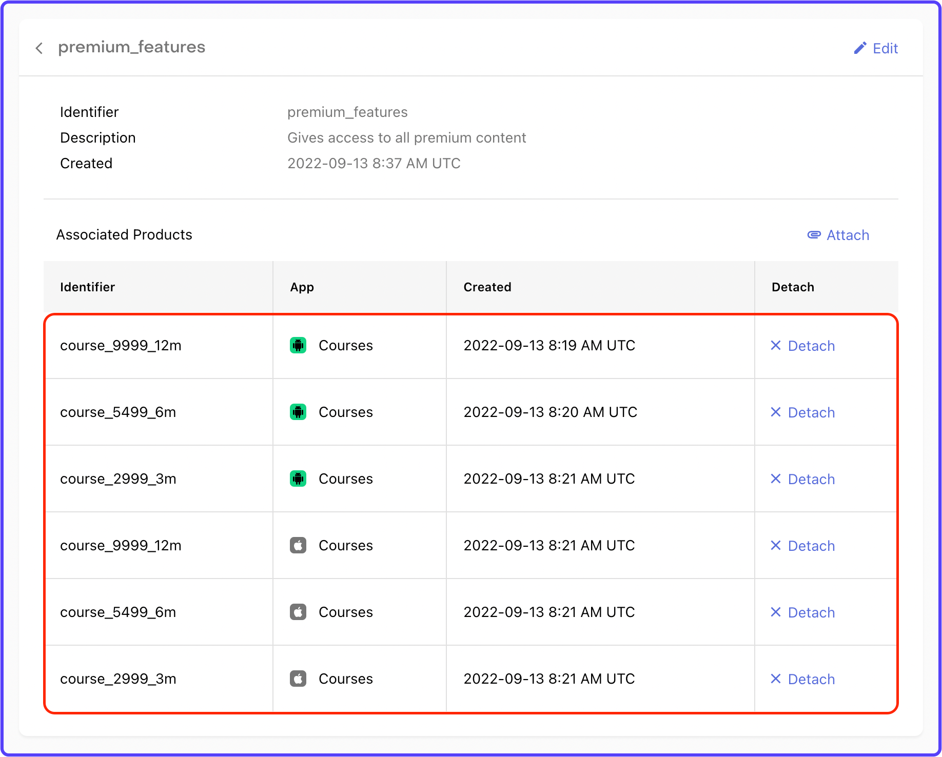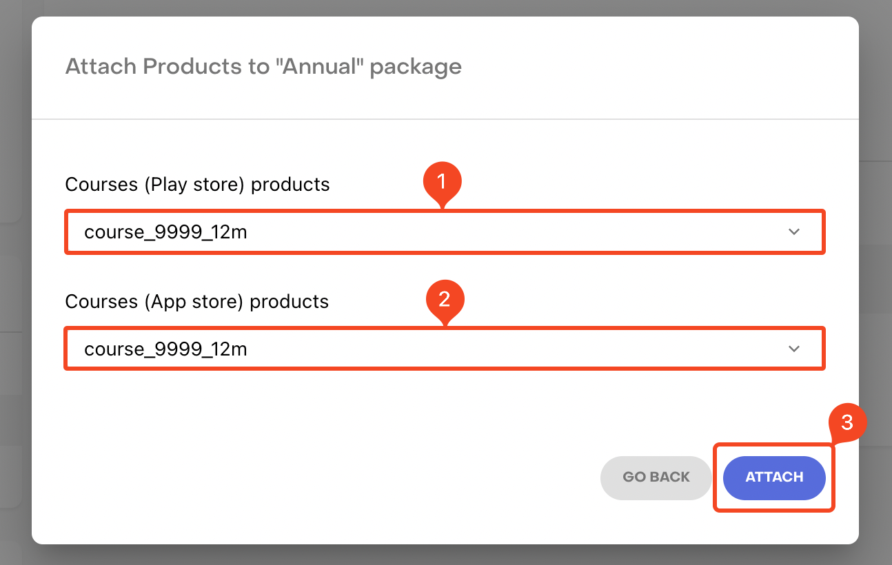 8. Select the respective Play Store and App Store products from the dropdown. Click Attach.