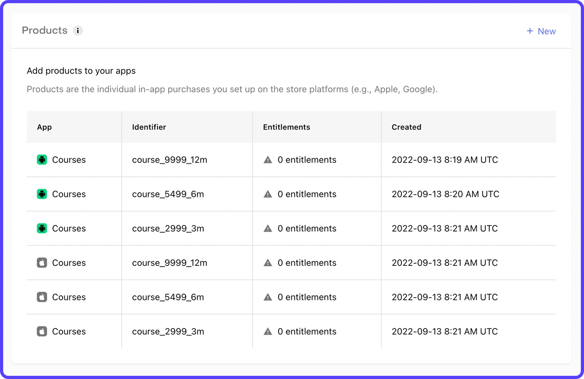 In this configuration, you need to add all the subscriptions for both your Android and iOS app that the user can purchase. This is like a 1-to-1 mapping of the products in RevenueCat that you have already added to the stores (Google Play Store and Apple App Store).