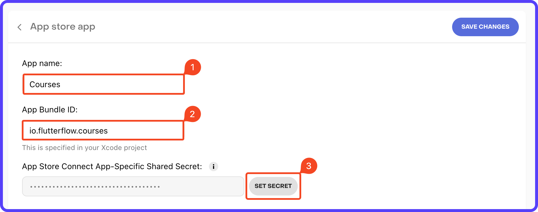 3. Enter an App name, Bundle ID, and App-Specific Shared Secret. To generate an App-Specific Shared Secret, follow the guide here. Once you have the key, click "SET SECRET", enter the value, and click Set. Then click "SAVE CHANGES".