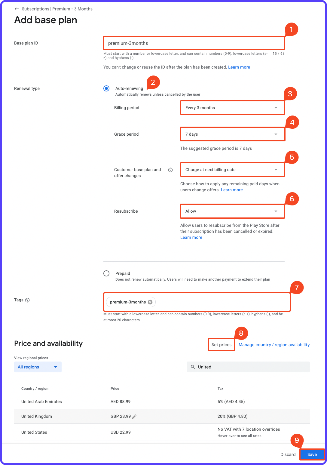 4. Enter the Base plan ID, Renewal type (RevenueCat supports only Auto-renewing), Tags, and Price. Click Save.