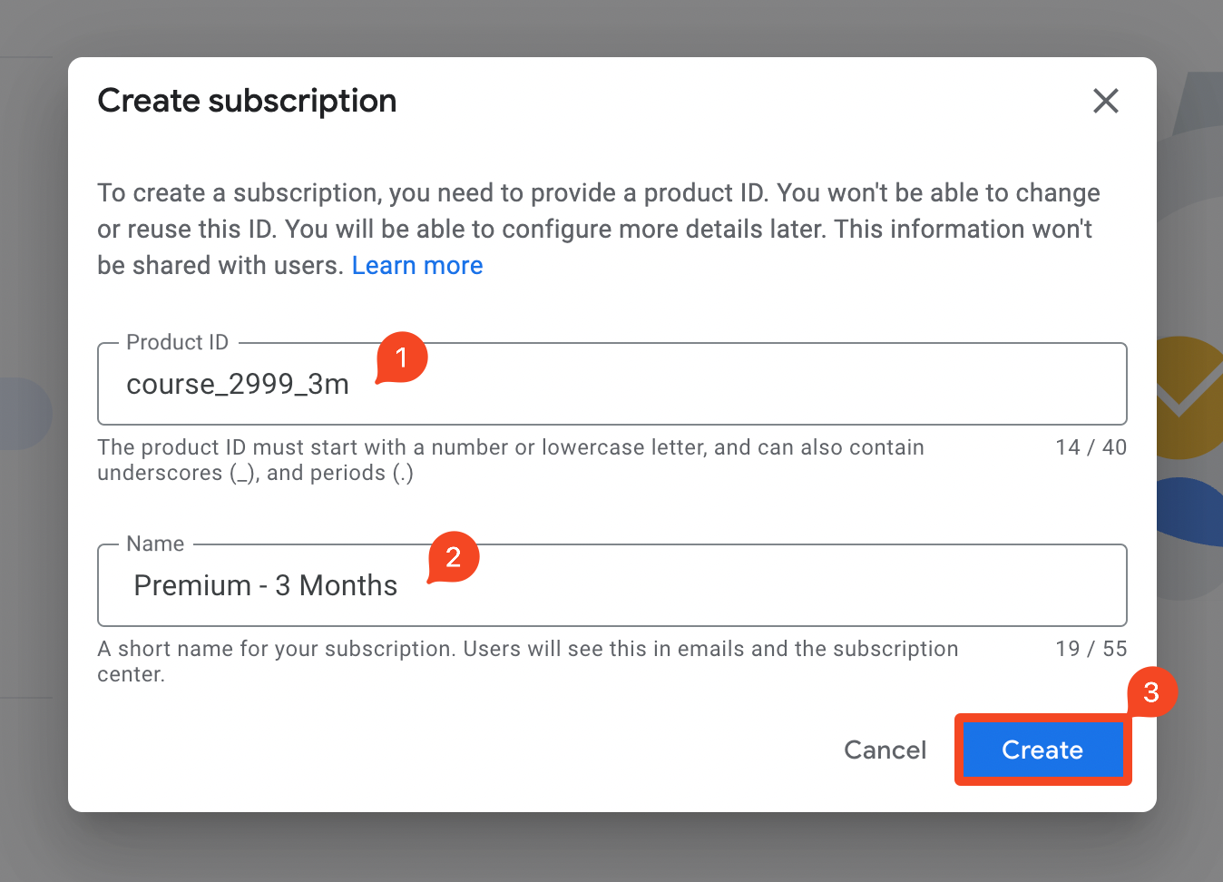 2. Enter a unique Product ID for your subscription and a publicly viewable Name. Click Create.