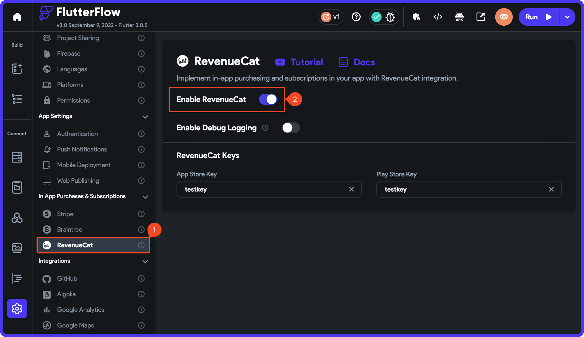 To use RevenueCat in your app, you must configure it inside FlutterFlow. If you have followed the Play Store subscription setup, you should already have RevenueCat integration enabled. But you still need to update the configuration to use the proper keys.