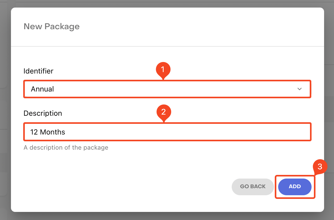 5. Enter an Identifier for the package from the dropdown and add a Description. Click ADD.