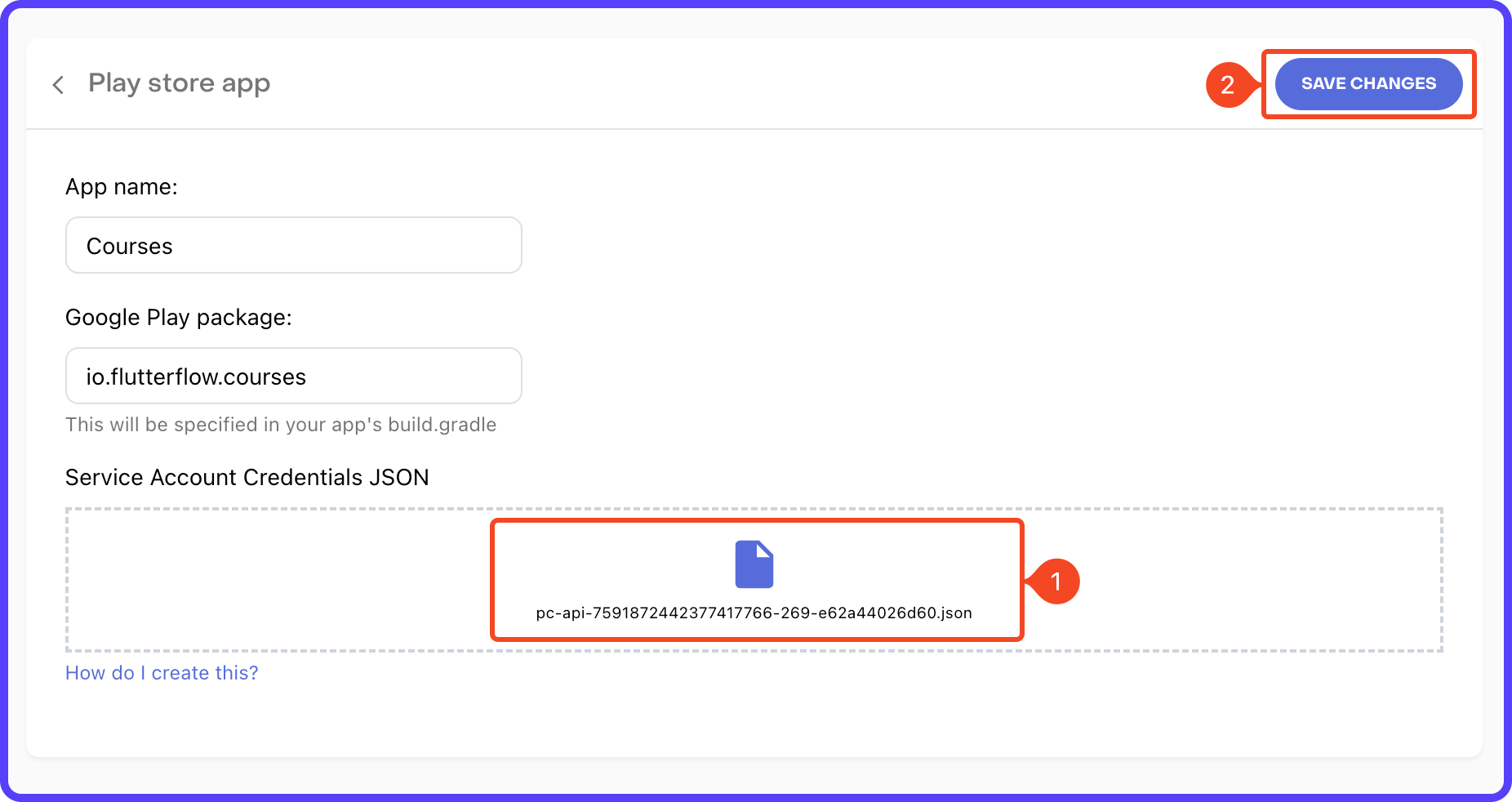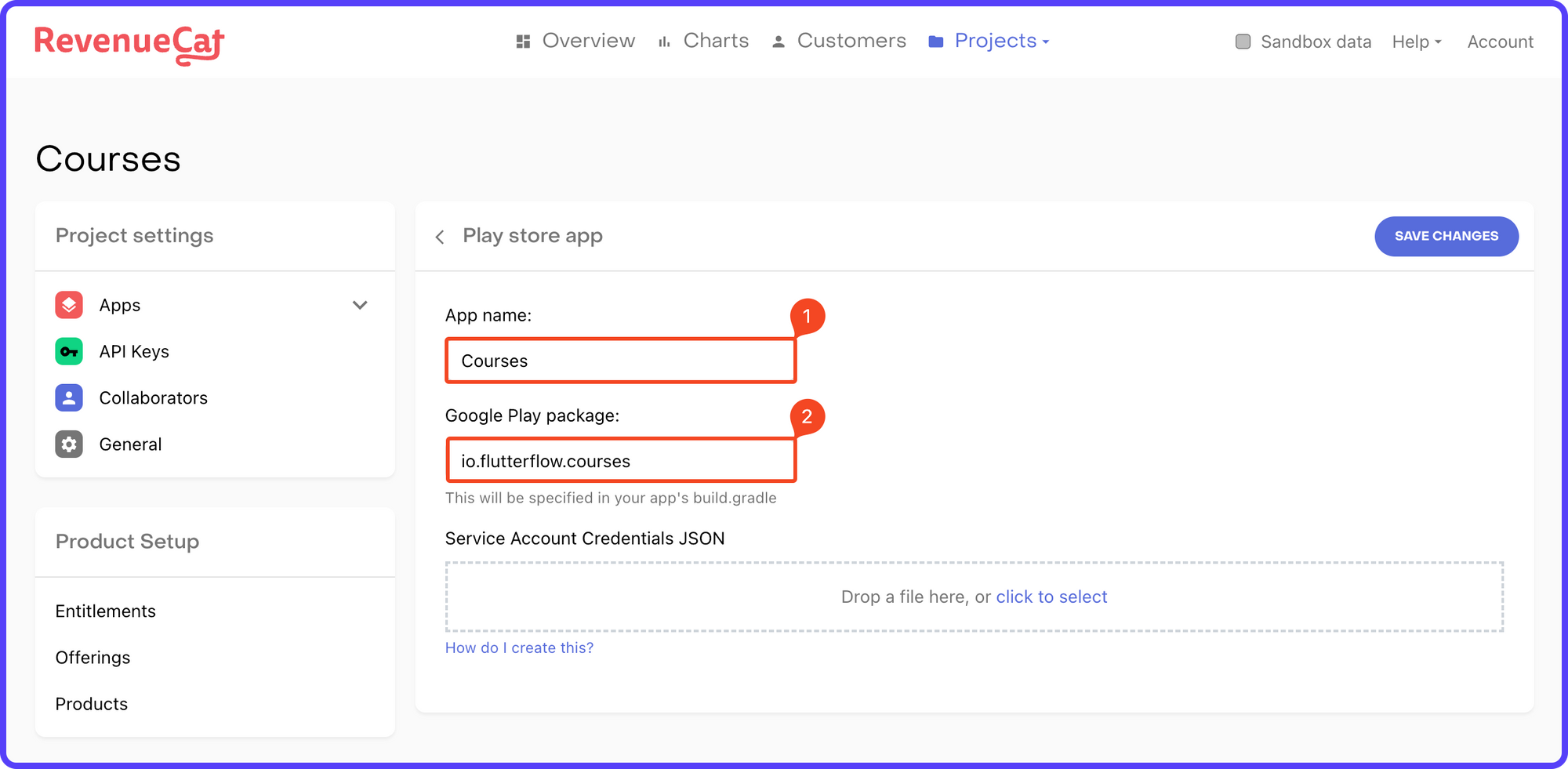 3. You need to create another Service Account for RevenueCat. Follow this guide to generate the credentials in JSON format. Drag and drop the Credentials JSON file. Click "SAVE CHANGES".