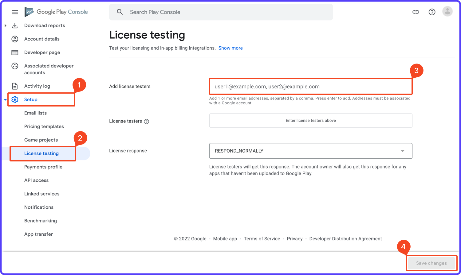 - In the Add license testers field, add an email address associated with a Google account and with which you are currently logged in on your Android device. Press Enter to add the email address.