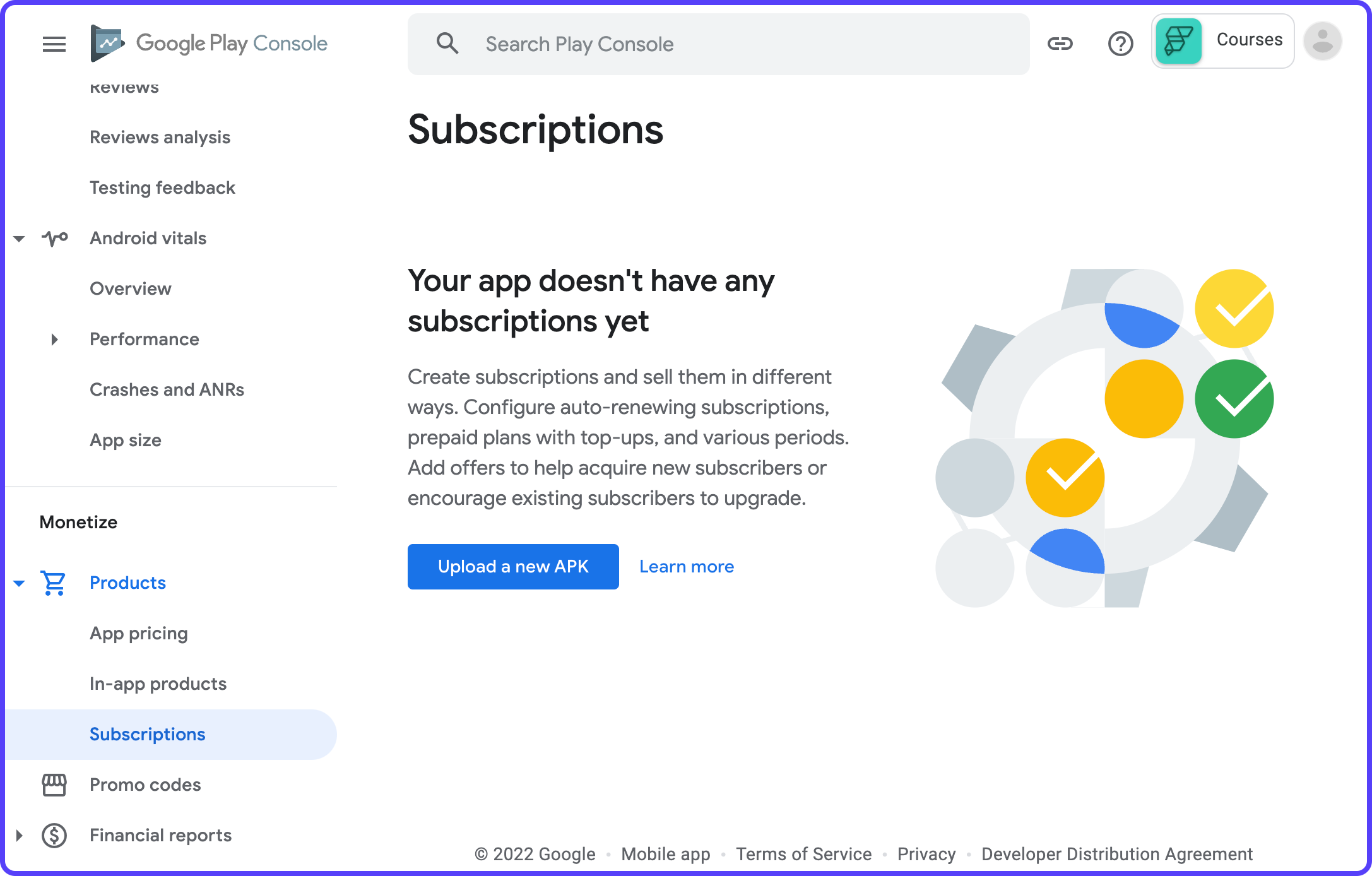 Wait for the Play Store deployment to complete. Now, go back to the Subscriptions page from the Google Play Console. You should see that message is gone, and you will be able to create subscriptions.