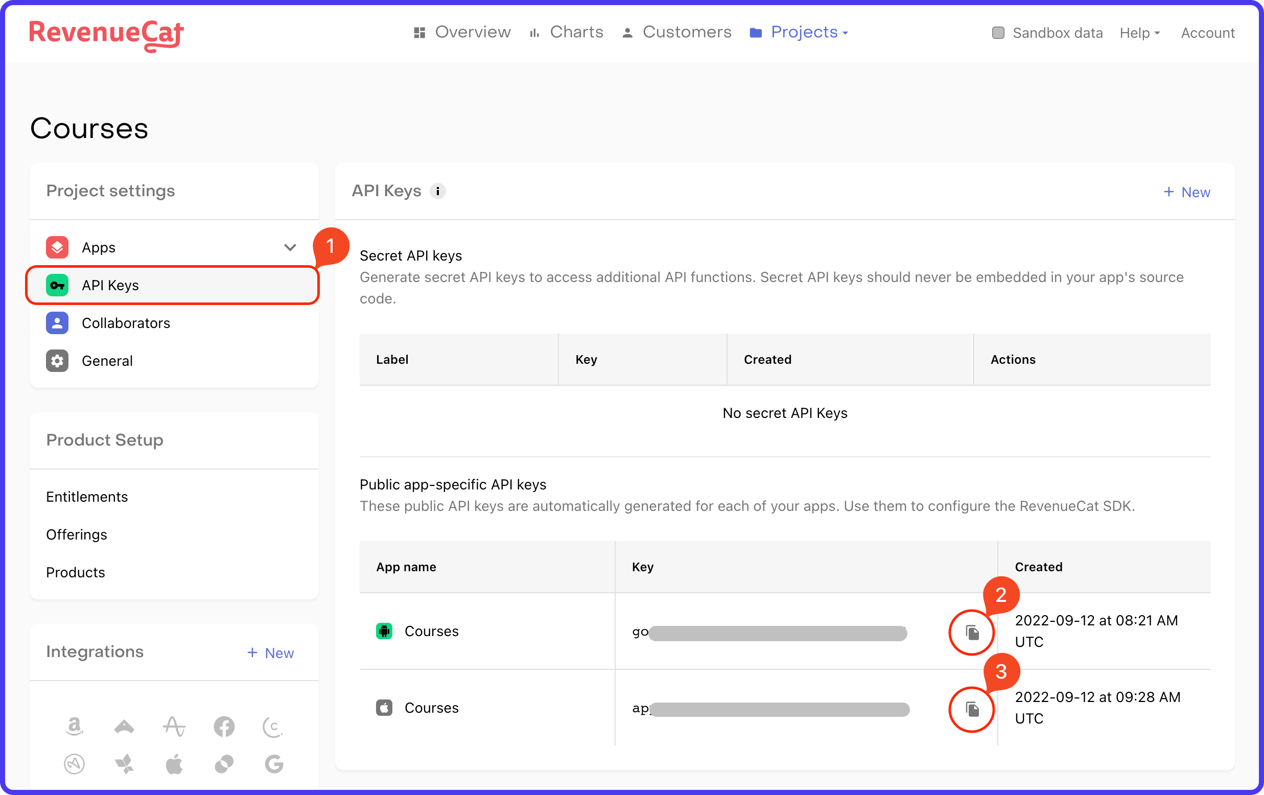 - Navigate to Settings & Integrations > RevenueCat page (under In App Purchases & Subscriptions section).