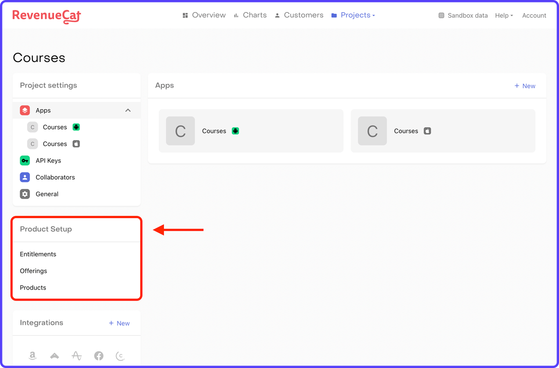 You will find these configuration levels on the left menu of the RevenueCat dashboard under the section Product Setup: