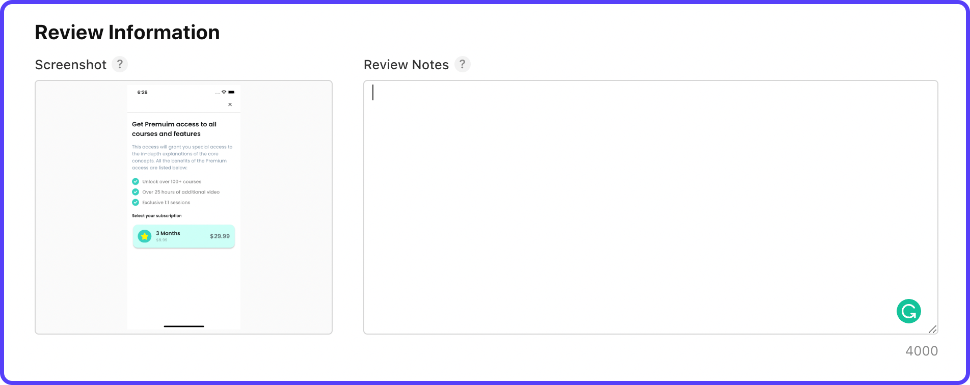 16. Under the Review Information section, add a screenshot of the subscription screen of your app (you can also add a blank screenshot, having proper size for now, if you haven't yet created the subscription UI).
