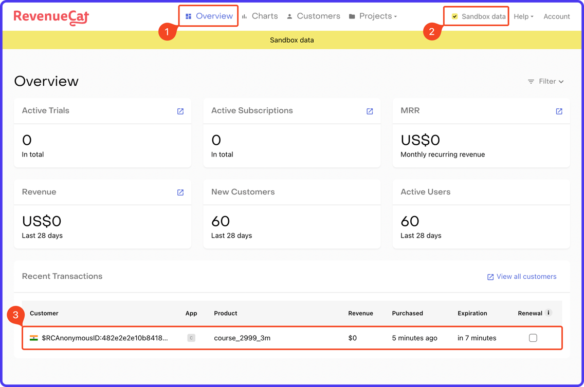 After you perform any test transactions, you should be able to Preview them on the RevenueCat dashboard by:
