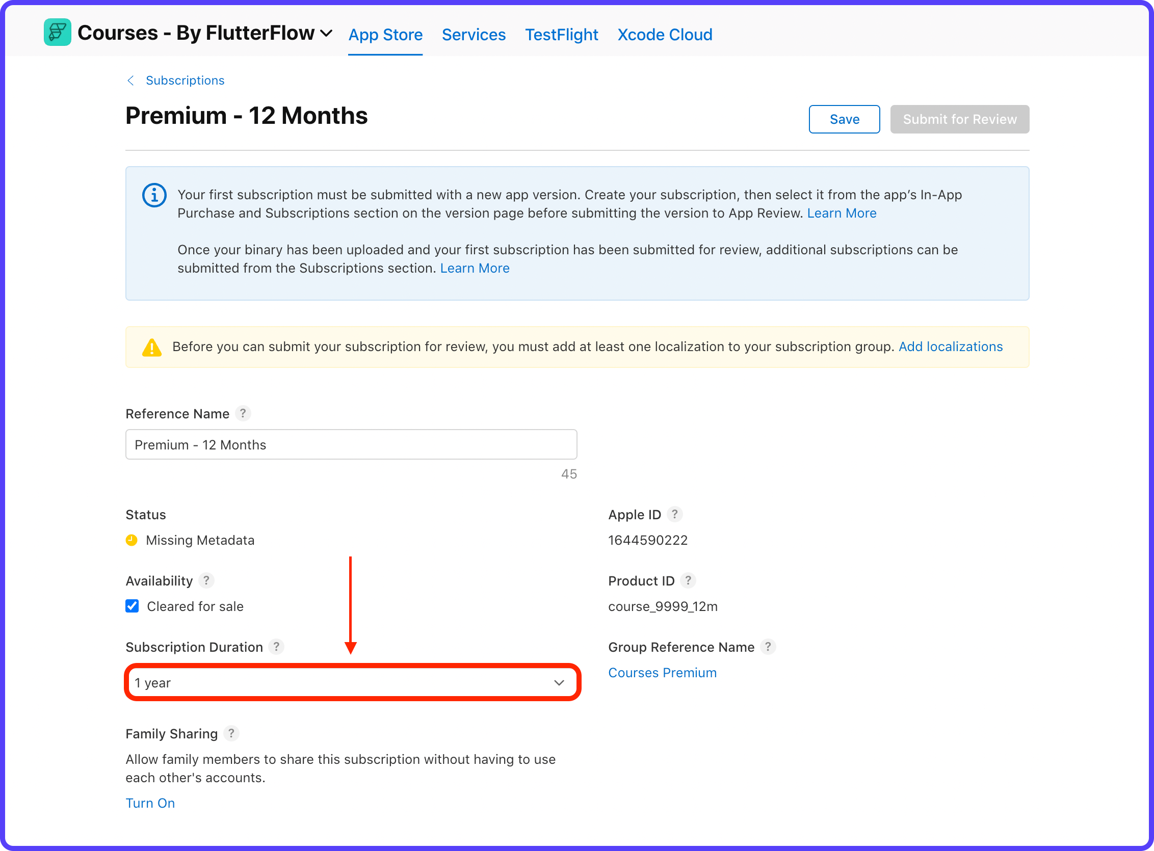 17. Scroll up to the top of the subscription page, and click Save. You will see a warning message if you haven't yet added localization to your subscription group. Click Add localizations (skip if you have already added).