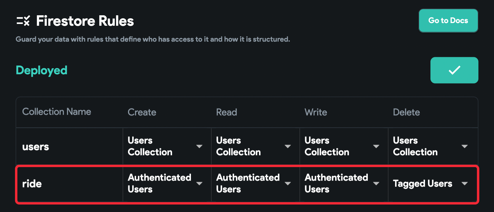 Finally, go to the Firestore Settings, update the security rules for the ride collection under Firestore Rules, and click Deploy.