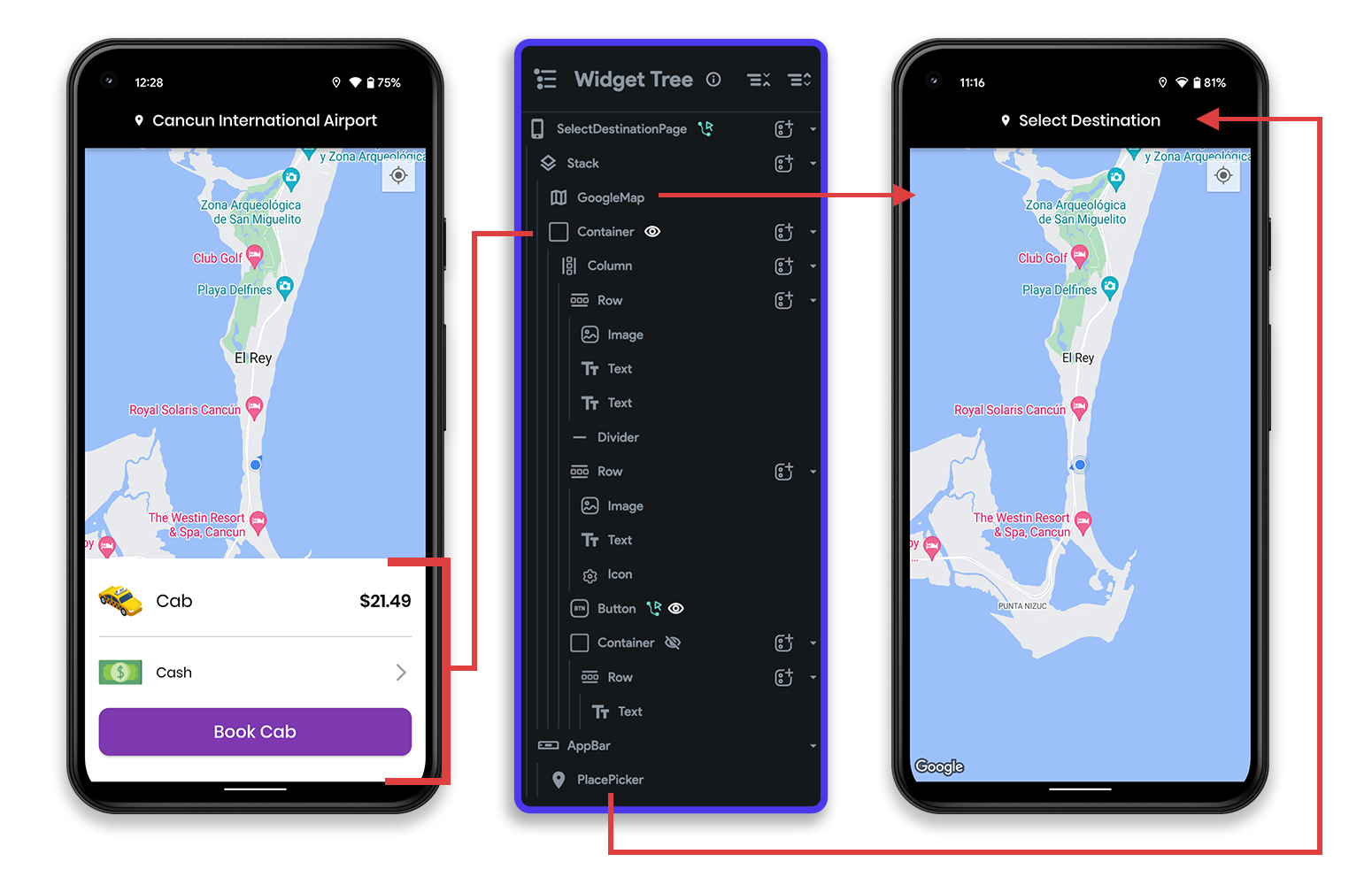 Now, the ride details will only be visible to the user once the destination is set using the PlacePicker widget.