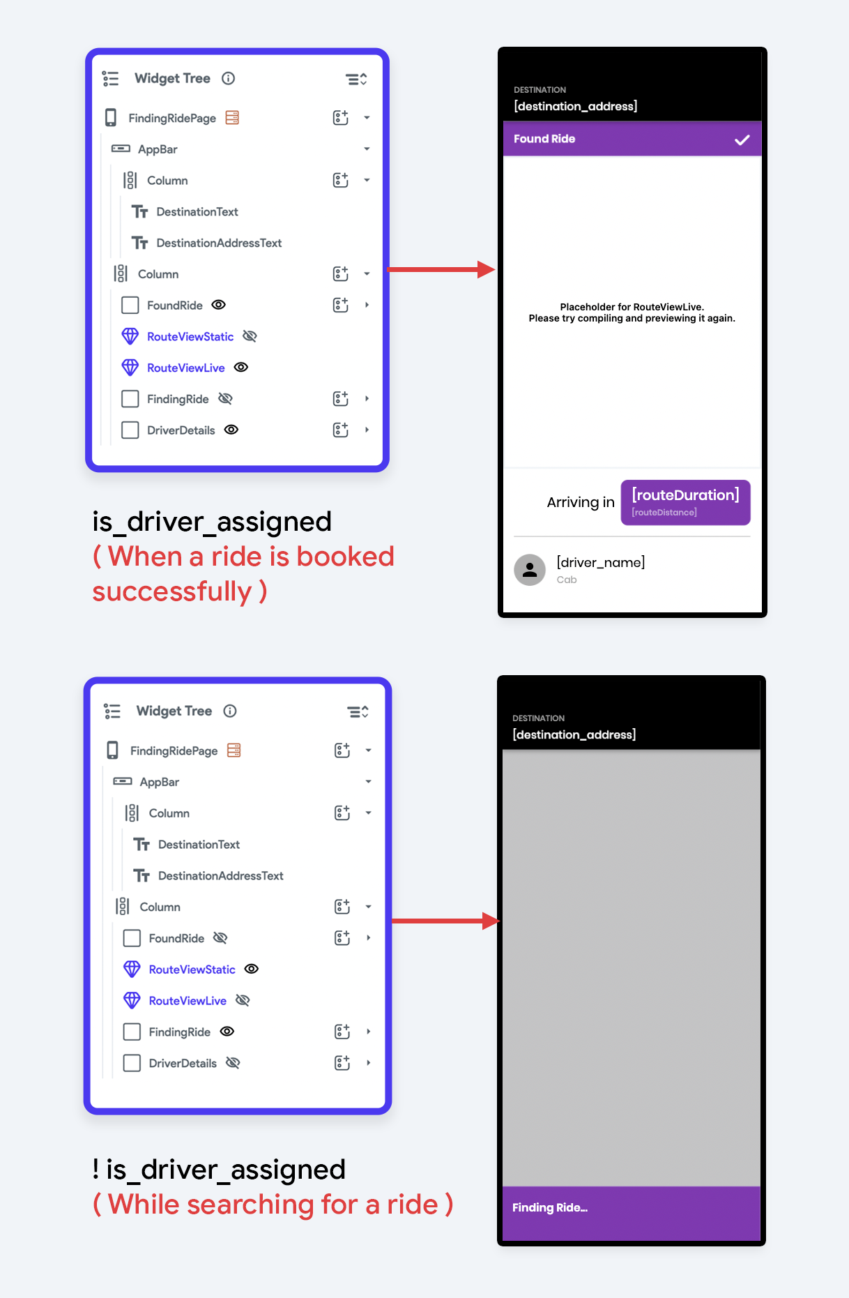 Set the Conditional Visibility to show this widget only when a cab is successfully booked (i.e., when the value of is_driver_assigned is true).