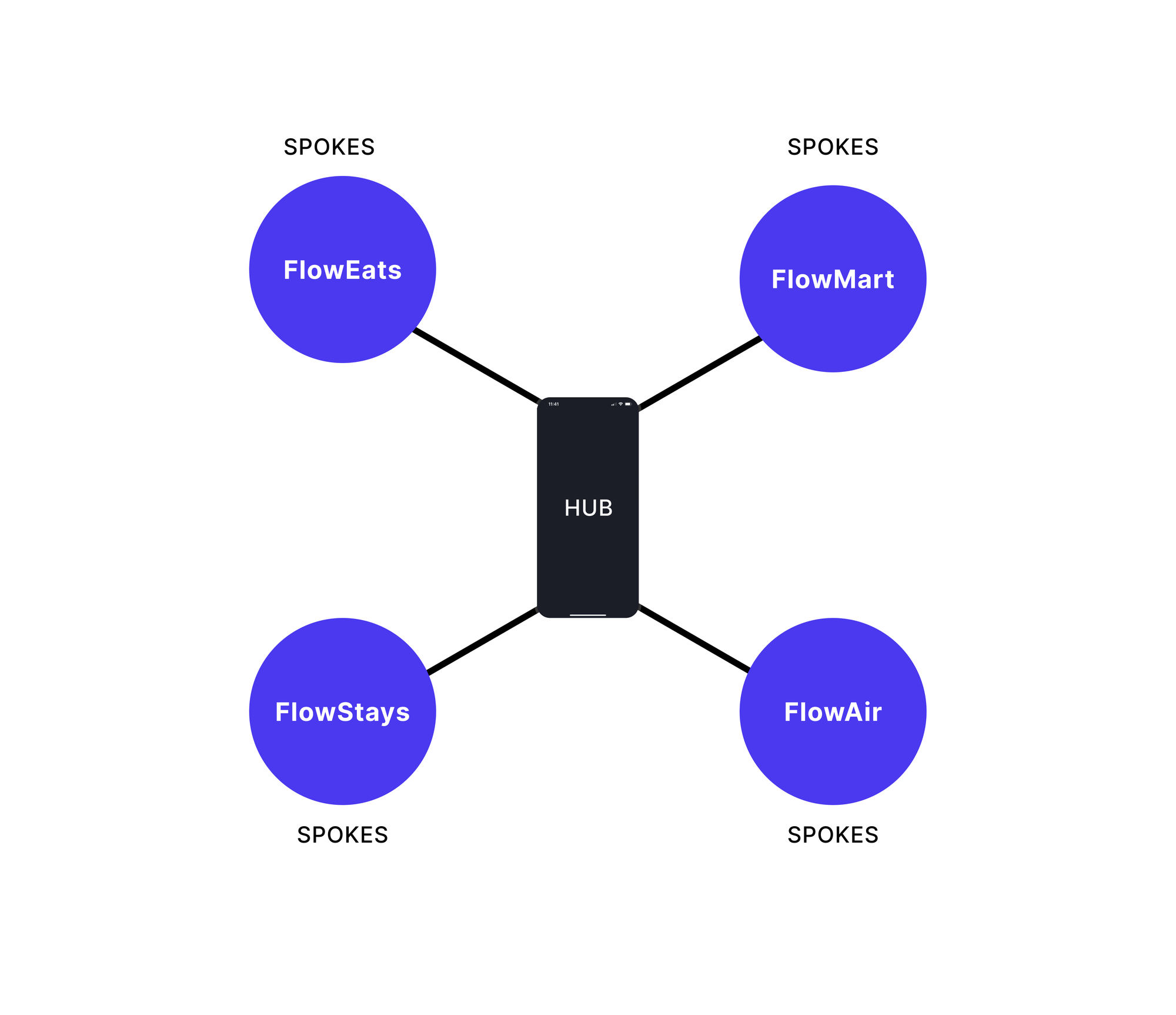 Spoke Modules - Independently developed feature libraries (e.g. FlowEats, FlowMart, FlowStays) that represent complete user journeys. Each is imported into the Hub and integrated into the main app flow.