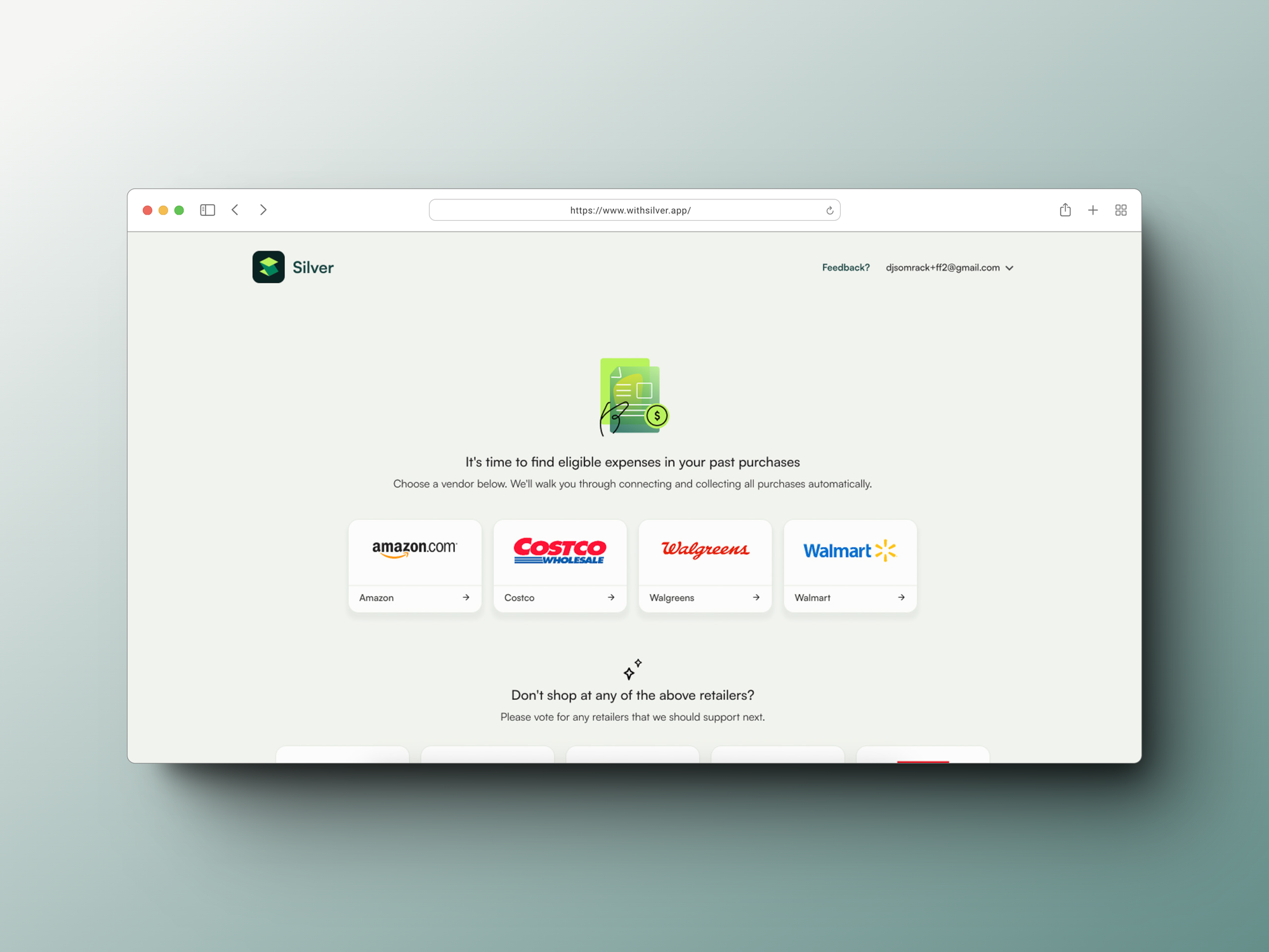 Silver simplifies the process of claiming FSA/HSA reimbursements by automatically collecting and processing receipts from major retailers like Amazon, Costco, and Walgreens. Here’s how it works: