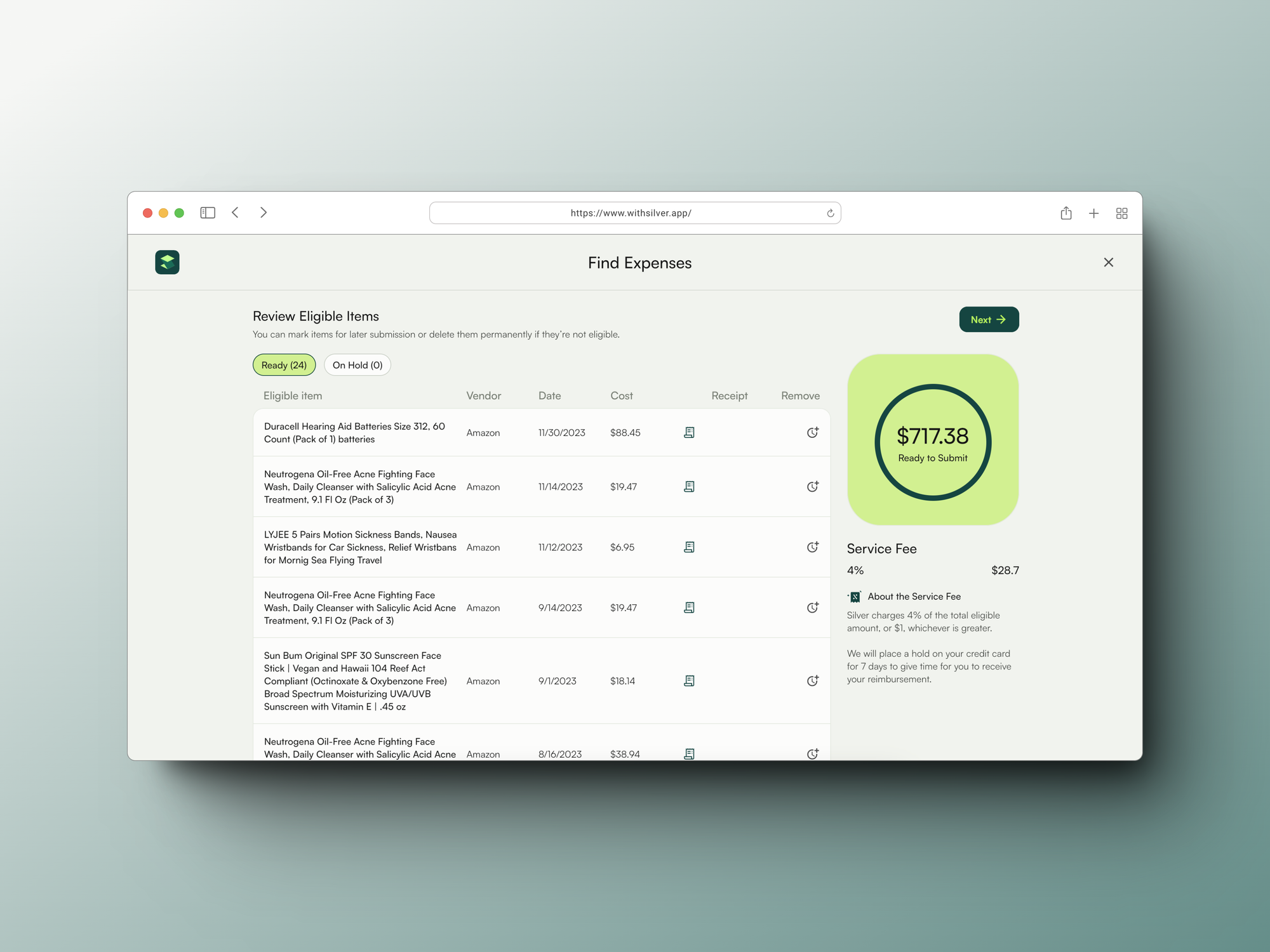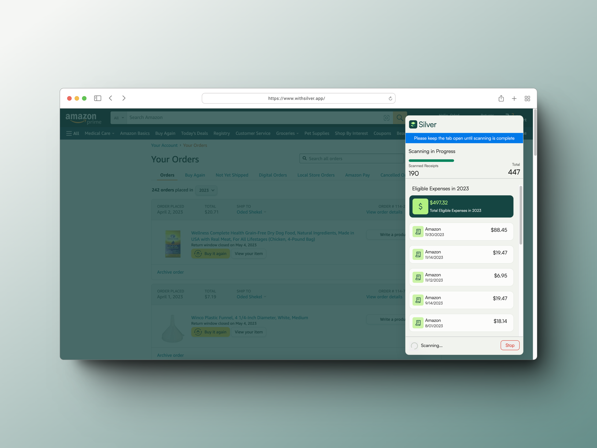 Chrome Extension for Receipt Collection: Silver uses a Chrome Extension to navigate a user’s retailer accounts, sifting through purchase histories to identify eligible medical expenses.